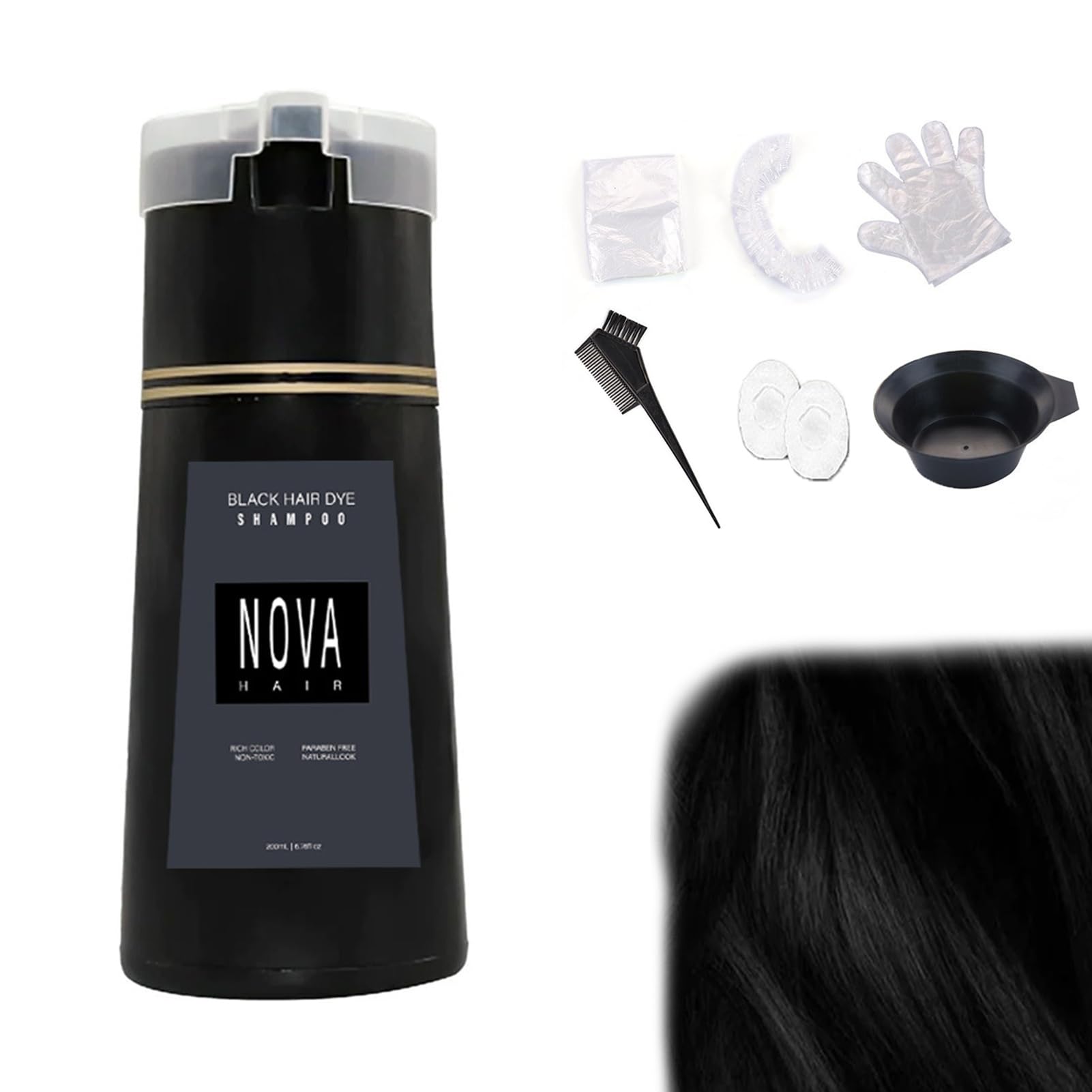 Features: 1. Formulated to help you achieve vibrantly colored locks, this hair color shampoo dye will treat your hair with a special combination of active botanicals. 2. No special skills or tools are required, and it can be used like a normal shampoo. 3. Whether you have straight, curly or colored hair, our hair dye shampoo for women and men is suitable, it evenly covers every strand of hair and provides a balanced color effect, allowing you to show your unique style and personality. 4. Get back the lost luster, and replenish the health of your weak strands with Nova hair color. Specification: Ingredients: Ginseng Extract, Black Sesame Extract, Saponin Extract, Ganoderma Lucidum Extract, Fo-Ti Extract Weight: 288g (with box) Package size: 19 7.4 6.5cm Colors: Black, Light Brown, Dark Brown, Red, Purple Package Includes: 1 Nova Hair Dye Shampoo 6 Hair Dyeing Tools(Shower Cap, Ear Muffs, Hair Coloring Comb, Gloves, Shawl, Mixing Bowl) GEBRUIKSAANWIJZING Voorbereiding: Gebruik het product als normale shampoo. Gebruik: aanbrengen op vochtig haar en verdeel het Verwerkingstijd: 10 minuten. Na gebruik grondig uitspoelen. Post-Coloring Care: volgens de normale haarverzorgingsroutines richten. VEILIGHEIDSWAARSCHUWING 1 Meer bekijken[Instant Hair Color Boost] - Revitalize your hair with a new vibrant shade in just 10 minutes. Cover early grays and enjoy a natural-looking shade for 4-6 weeks with our innovative Nova hair instant dye shampoo formula. [Safer, More Effective Dyeing Method] - Avoid damaging effects of ammonia and peroxide found in traditional hair dyes. Our Nova hair shampoo formula is gentle on your hair and scalp, reducing the risk of irritation and allergic reactions. [Save Money and Time] - Our color shampoo is an affordable and convenient alternative to expensive salon treatments. You can achieve salon-quality results at home without spending a fortune or wasting time. [Natural Ingredients, Healthier Hair] - Infused with natural ingredients, our hair dye shampoo nourishes your hair while providing gray coverage, ensuring luxuriously shiny and healthy hair without harsh chemicals or ammonia. [Effortless Dark Hair Transformation] - Achieve rich, dark hair effortlessly with our groundbreaking NovaHair shampoo. No need for multiple salon visits or complex dyeing routines.Nova Haarkleuring Shampoo voor Vrouwen en Mannen - Instant Kleurende Shampoo (Zwart) Features: 1. Formulated to help you achieve vibrantly colored locks, this hair color shampoo dye will treat your hair with a special combination of active botanicals. 2. No special skills or tools are required, and it can be used like a normal shampoo. 3. Whether you have straight, curly or colored hair, our hair dye shampoo for women and men is suitable, it evenly covers every strand of hair and provides a balanced color effect, allowing you to show your unique style and personality. 4. Get back the lost luster, and replenish the health of your weak strands with Nova hair color. Specification: Ingredients: Ginseng Extract, Black Sesame Extract, Saponin Extract, Ganoderma Lucidum Extract, Fo-Ti Extract Weight: 288g (with box) Package size: 19 7.4 6.5cm Colors: Black, Light Brown, Dark Brown, Red, Purple Package Includes: 1 Nova Hair Dye Shampoo 6 Hair Dyeing Tools(Shower Cap, Ear Muffs, Hair Coloring Comb, Gloves, Shawl, Mixing Bowl) GEBRUIKSAANWIJZING Voorbereiding: Gebruik het product als normale shampoo. Gebruik: aanbrengen op vochtig haar en verdeel het Verwerkingstijd: 10 minuten. Na gebruik grondig uitspoelen. Post-Coloring Care: volgens de normale haarverzorgingsroutines richten. VEILIGHEIDSWAARSCHUWING 1 Meer bekijken[Instant Hair Color Boost] - Revitalize your hair with a new vibrant shade in just 10 minutes. Cover early grays and enjoy a natural-looking shade for 4-6 weeks with our innovative Nova hair instant dye shampoo formula. [Safer, More Effective Dyeing Method] - Avoid damaging effects of ammonia and peroxide found in traditional hair dyes. Our Nova hair shampoo formula is gentle on your hair and scalp, reducing the risk of irritation and allergic reactions. [Save Money and Time] - Our color shampoo is an affordable and convenient alternative to expensive salon treatments. You can achieve salon-quality results at home without spending a fortune or wasting time. [Natural Ingredients, Healthier Hair] - Infused with natural ingredients, our hair dye shampoo nourishes your hair while providing gray coverage, ensuring luxuriously shiny and healthy hair without harsh chemicals or ammonia. [Effortless Dark Hair Transformation] - Achieve rich, dark hair effortlessly with our groundbreaking NovaHair shampoo. No need for multiple salon visits or complex dyeing routines.
