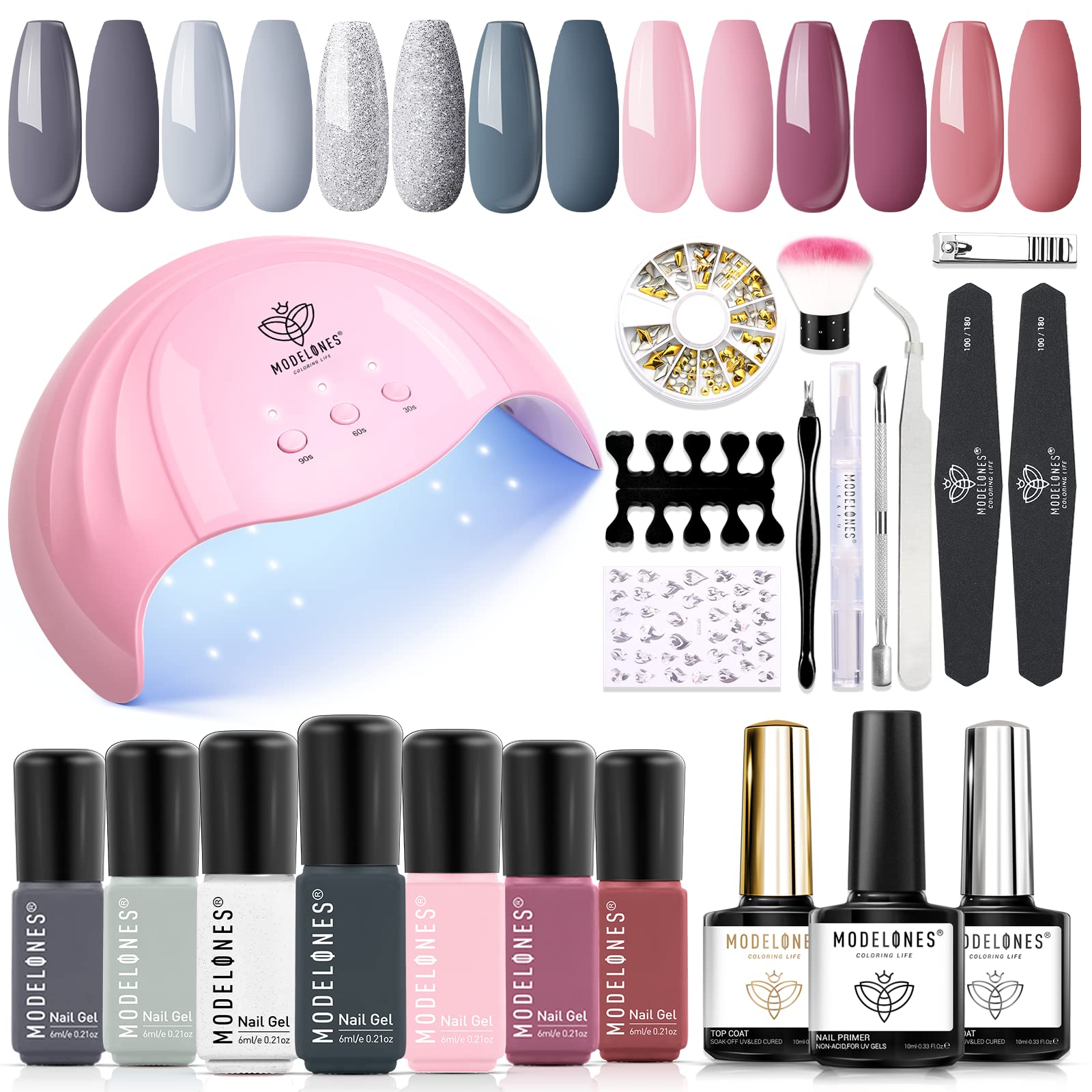 Modelones Gel Nail Kit Gel Nail Polish Kit with 48W LED Light - 7 Widely Worn Color Gel Nail Polish Set, Stater Kit for Gel Manicure Beginner Nail Art Lover, Fashion Packaging for Gift Set A - Grey