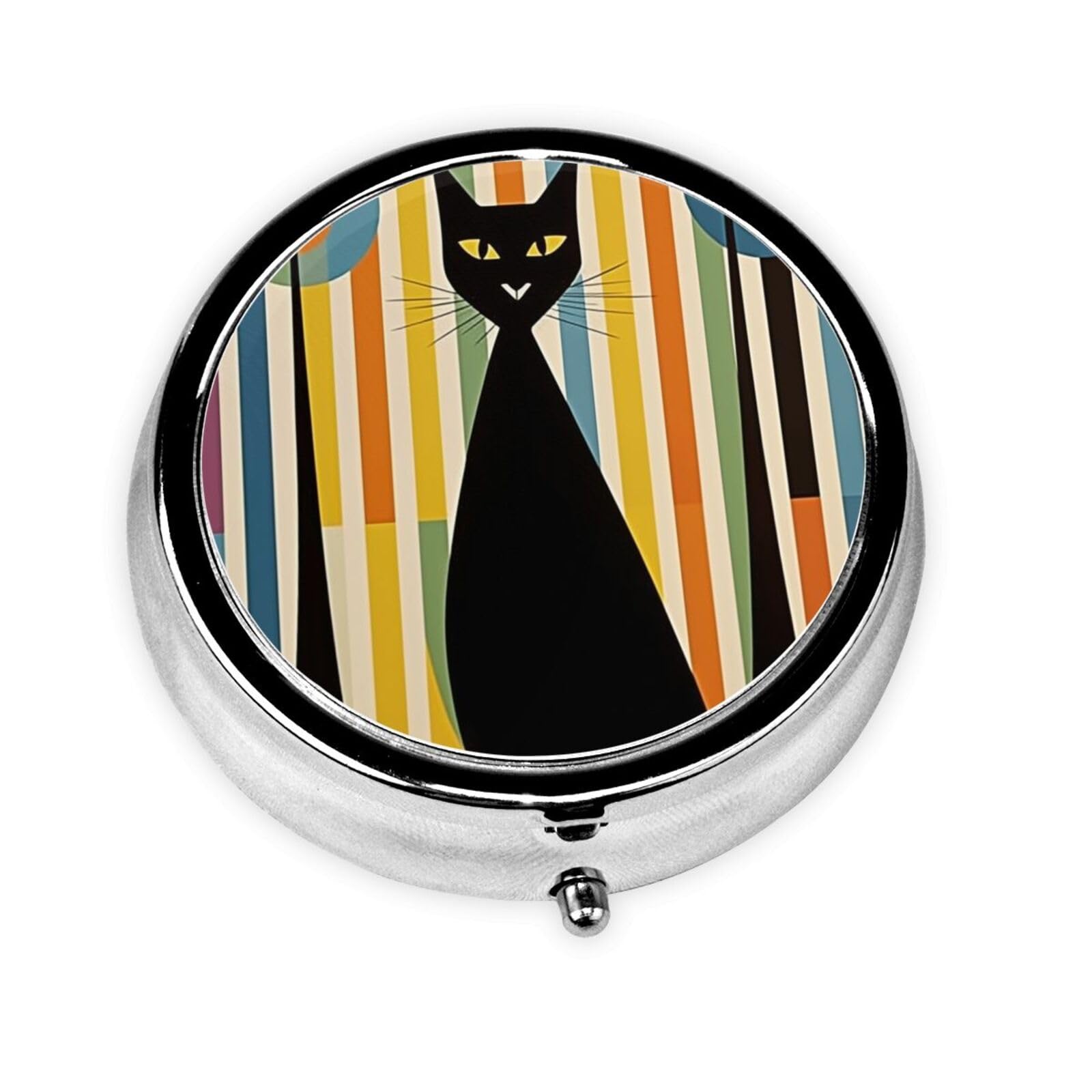 Modern Art Cat Portable Metal Pill Box Round Mini 3-Compartment Plastic Insert hinged Fastening Design Suitable for Small Pills Must-Have for Travel