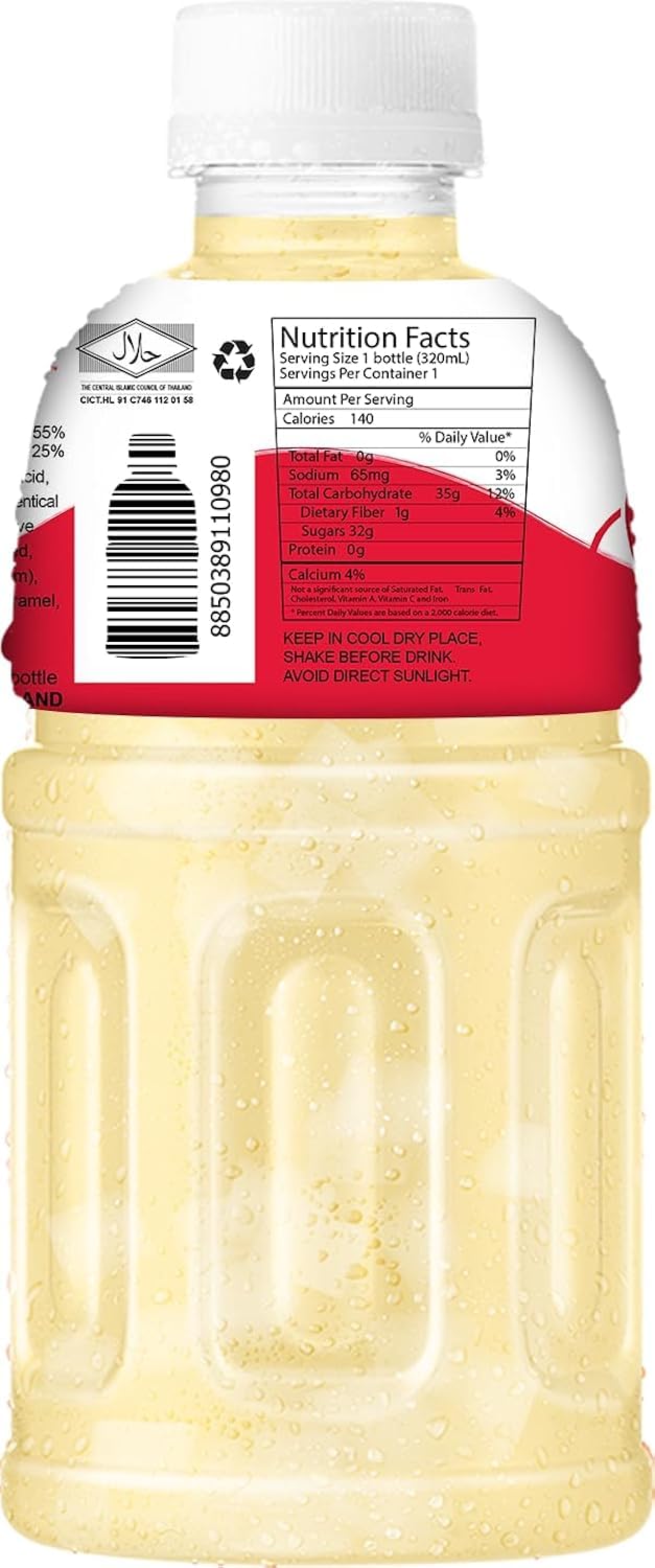 DESCRIPTION DU PRODUIT Ingrédients: Eau, Nata de Coco, Fructose, Sucre, Régulateur d'acidité (acide citrique), Nature Identical Flavour (pomme), Couleur artificielle (caramel ordinaire, carotènes mixtes), Conservateur (benzoate de sodium), Ajouté. Contient de la noix