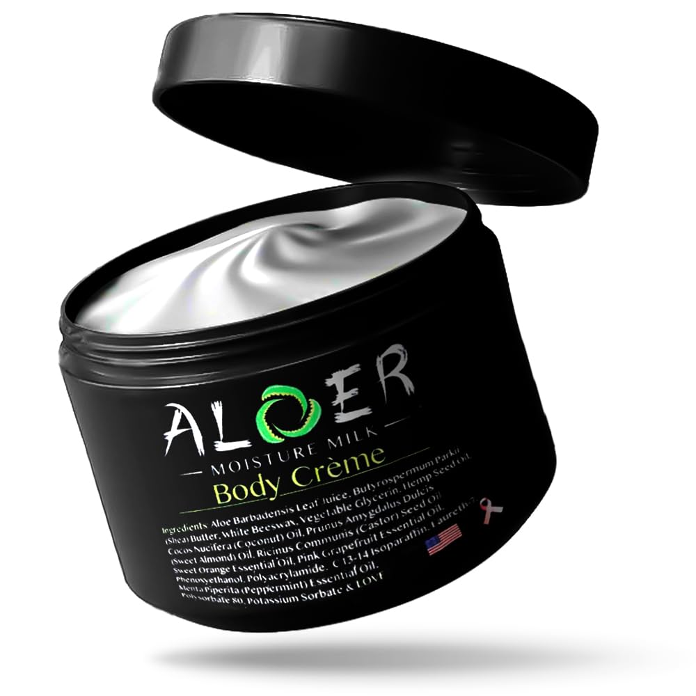 ALOER-contains Castor seed oil, Pure Aloe Vera, Coconut Oil, Sweet Almond Oil, Hemp Seed Oil, Shea Butter, Essential Oils, No alcohol, sulfates, or parabens. SKIN MOISTURIZER & CONDITIONER -24 hour hydration Fights the signs of aging and leaves your skin silky smooth without clogging your pores Can also be used as a leave-in conditioner and provides moisture for your lips, minor skin / scalp irritations, & eczema, fine lines, wrinkles, cellulite, surgery scars, stretch marks, and rough and dry cracked hands and feet. ALL-NATURAL & ORGANIC-properties with a proprietary formula, pure aloe vera, coconut oil, and organic hemp seed oil, are essential for fighting against damaged skin caused by heat, dryness, and irritation. Leaves your skin feeling soft and smooth. UNISEX- full body moisturizer. made with ingredients such as Aloe Vera, coconut oil, and beeswax that are essential in fighting against damaged skin caused by heat, dryness, irritation, and exposure to other harmful chemicals. Cruelty-free, fragrance-free, paraben free. SKIN REPAIR MULTIPURPOSE -ALOER Moisture Milk Body Creme is an all-natural 100% pure aloe skin nourisher, It protects the skin, leaving it silky smooth without clogging your pores. ALOER Moisture Milk Body Creme can also be used as a leave-in conditioner or moisturizer for your scalp, lips, or beard, hairline, and edges. Promotes healing and soothes bruises, liposucion and cosmetic surgery.