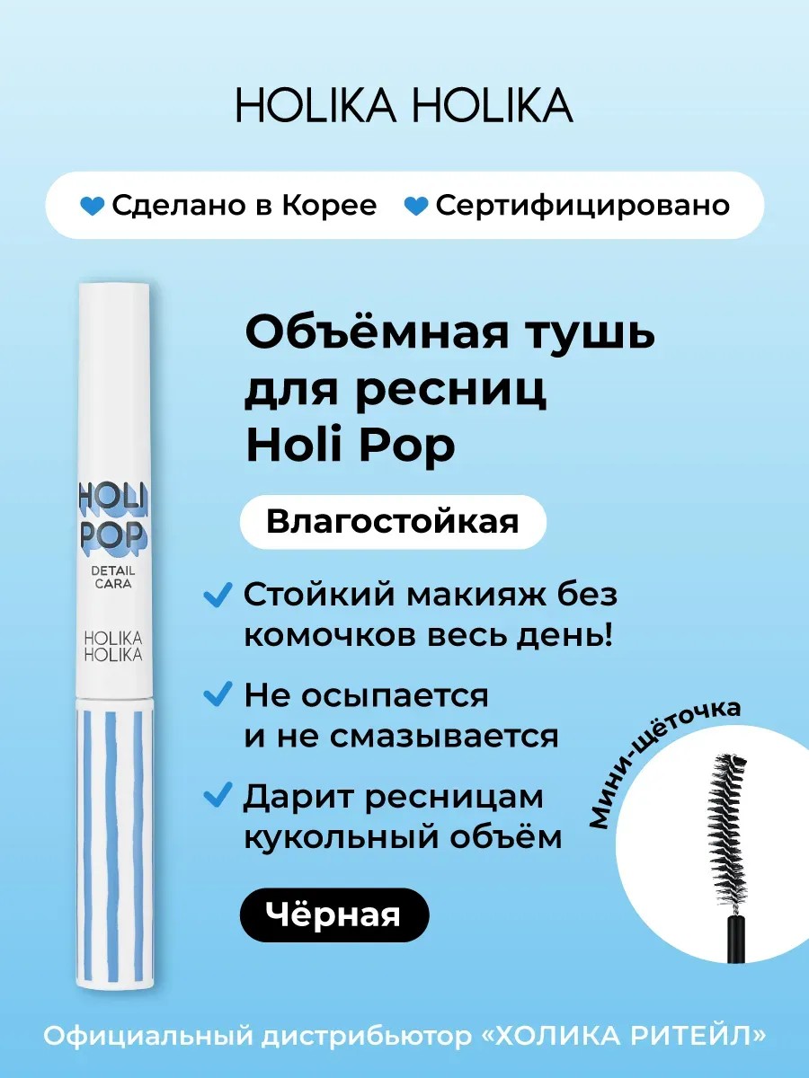Тушь для объёма Holi Pop поможет создать шикарный взгляд! Удобная форма изогнутой щёточки быстро и без комочков дарит ошеломительный объём. Влагостойкая тушь для ресниц держится на ресницах целый день, не растекается и не осыпается, выдерживает снег, дождь и даже слёзы (но, надеемся, только от счастья!). Маленькая кисточка равномерно распределяет термотушь и не образует комочков. D-пантенол и биотин защищают ресницы, питают и ускоряют их рост. Корейскую тушь можно смыть тёплой водой – она сойдёт чулочками. Долой эффект панды под глазами! Способ применения: нанесите тушь на ресницы зигзагообразными движениями. Слова для поиска: водостойкая тушь для ресниц чёрная, макияж, декоративная косметика, косметика для макияжа, удлиняющая тушь