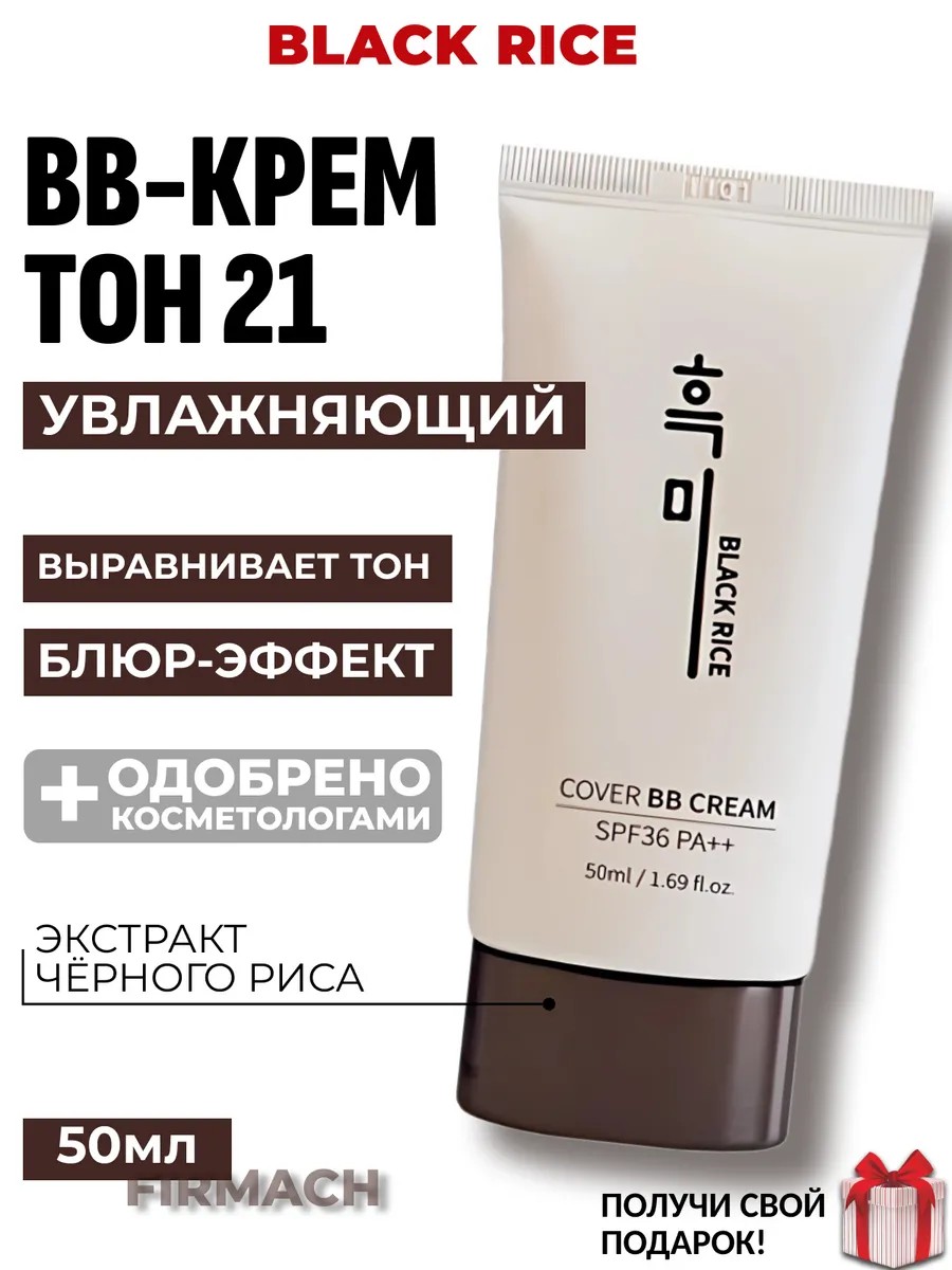 BB-крем Black Rice Cover BB Cream SPF36 PA++ тон 21 подстраивается под тони кожи и создаёт лёгкое покрытие, разглаживает рельеф и выравнивает тон, увлажняя и смягчая. Средство с блюр-эффектом отлично тонирует, не закупоривает поры и не приводит к воспалению.