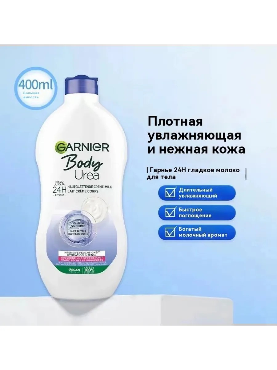 Интенсивное увлажнение на 7 дней! Лосьон для тела Garnier Intensive 7 Days с алоэ вера обеспечивает глубокое питание и регенерацию кожи, делая ее гладкой и бархатистой. Нежирная формула быстро впитывается, не оставляя липкости, и позволяет одеваться сразу после нанесения. Обладает успокаивающими свойствами. Активные ингредиенты: - Экстракт алоэ вера: интенсивно увлажняет кожу. Дерматологически протестировано, подходит для чувствительной кожи. Способ применения: небольшое количество лосьона нанесите на чистую кожу и равномерно распределите легкими массирующими движениями. Тип кожи: сухая, для всех типов кожи. Основные характеристики: - Тип: Молочко для ухода за кожей - Аромат: Молочный - Тип кожи: Для всех типов кожи - Область использования: Тело - Целевая аудитория: Взрослая - Пол: Женский - Единиц в одном товаре: 1 - Объем, мл: 400 - Форма выпуска: Флакон - Упаковка: Картонная коробка - Страна-изготовитель: Франция