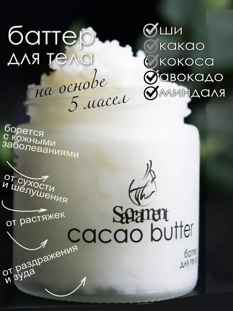 Баттер для тела - это твердое масло для тела. Содержит в себе пять питательных масел - из твердых масло ши, а также какао и кокоса. Из жидких масло авокадо и миндаля. Используются нерафинированные масла, сохранившие в себе всю пользу масел и все питательные компоненты. Баттер для ухода за телом отлично подойдет после депиляции, для удержания влаги после душа для увлажнения, а также восстановит кожу после загара. Увлажняющий баттер крем для тела из натурального масла - отличное средство для ухода за кожей. Этот антивозрастной продукт подходит как для женщин, так и для мужчин. Кокосовое масло обладает выраженными увлажняющими свойствами, оно помогает бороться со сухостью кожи, а также растяжками и трещинами на ногах. Какао увлажняет и питает кожу, придавая ей нежный шелковистый вид. Миндальное масло смягчает кожу, защищает от воздействия вредных факторов окружающей среды. Авокадо богато питательными веществами и витаминами, способствует регенерации клеток кожи. Этот антицеллюлитный крем помогает бороться с целлюлитом, при этом обеспечивая эффективный массаж для проблемных зон тела. В составе есть ши - липидное масло, которое обладает восстанавливающими свойствами. Уникальная формула продукта содержит пантенол - активный ингредиент, способствующий заживлению трещин на руках и ногах. Кроме того, он увлажняет и питает кожу без необходимости смывания. Этот уходовый набор из одного средства подарит вашей коже омолаживающий эффект благодаря пантеонольным компонентам. Также в составе есть Д-пантенол, который регенирирует и восстанавливает кожу. А в качестве антиоксиданта выступает витамин Е. Попробуйте этот легкий антивозрастной кремовый шоколадный баттер для похудения!