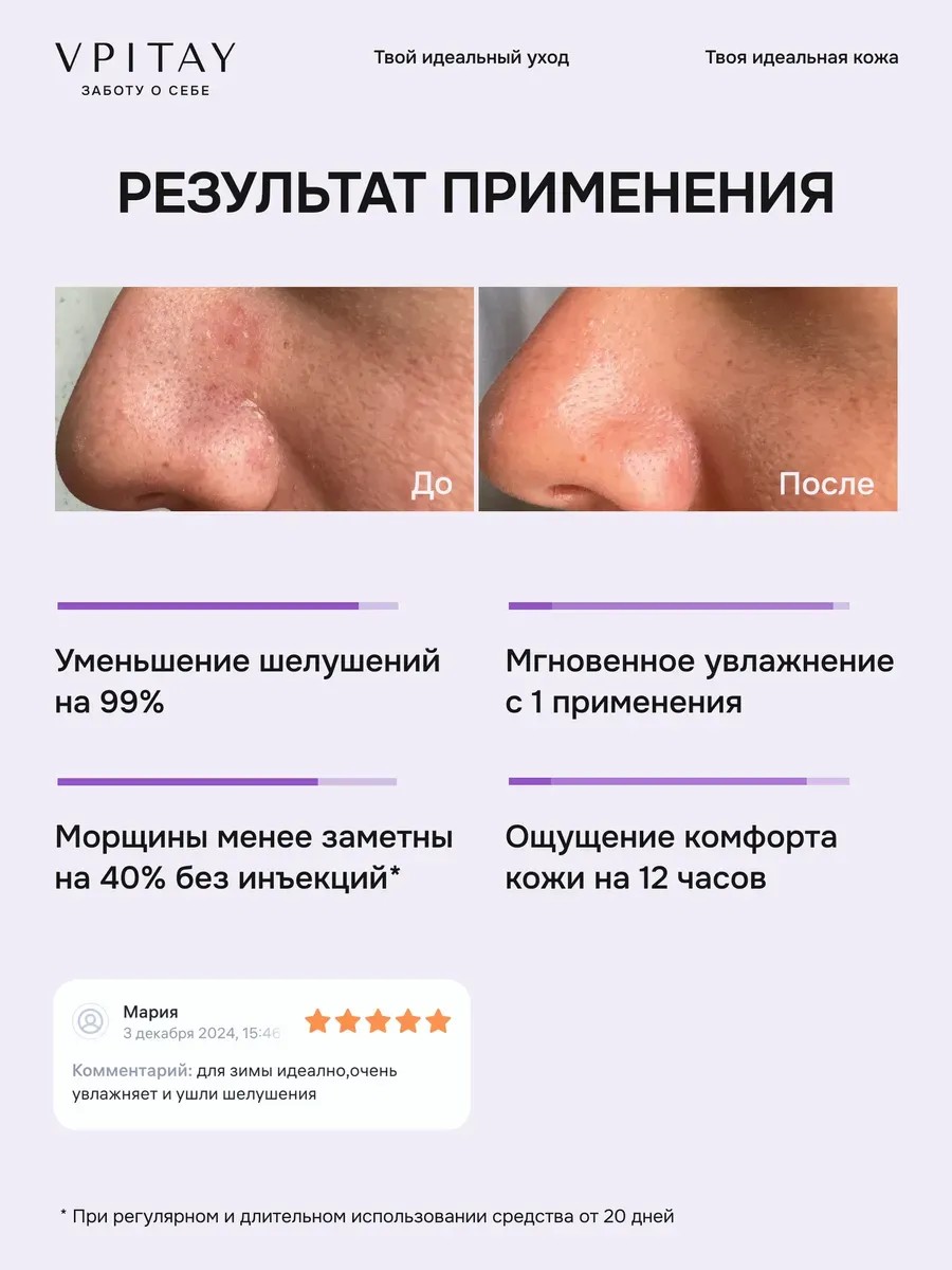 VPITAY Moisturizing Face Cream is a must-have for every woman who cares about her beauty and health. This versatile product is suitable for combination, oily, and normal skin. It's also suitable for sensitive, dry, and problematic skin. It perfectly moisturizes and conditions the face, protecting it from external influences. This original product was developed by dermatologist and cosmetologist Anna Kuzakova. Natural ingredients in this night face cream ensure maximum effectiveness and safety. The cream contains hyaluronic acid, which intensively moisturizes the skin. Ceramides create a protective barrier on the surface and help the deeper layers of the dermis retain moisture. Niacinamide provides a whitening effect, brightening the skin tone and eliminating age spots. Nicotinic acid also tightens enlarged pores, reduces redness, relieves inflammation, and fights acne. This nourishing face cream contains a powerful natural antioxidant that naturally slows the aging process. This summer skincare product promotes collagen production, helps combat age-related changes, and protects the skin from loss of elasticity and tone. Hyaluronic acid powerfully nourishes and hydrates the dermis, providing a rejuvenating, firming, healing, and soothing effect. This anti-aging day cream is ideal for the neck and décolleté area. It effectively combats dryness, flaking, and irritation, leaving skin firmer and more radiant. Using this nourishing cream brightens the skin tone, giving it a natural glow. Its light texture and convenient dispenser make it very economical to use. This nourishing day cream is economical to use thanks to its dispenser bottle, which dispenses enough product for one application when pressed. It is as effective as Korean cream.