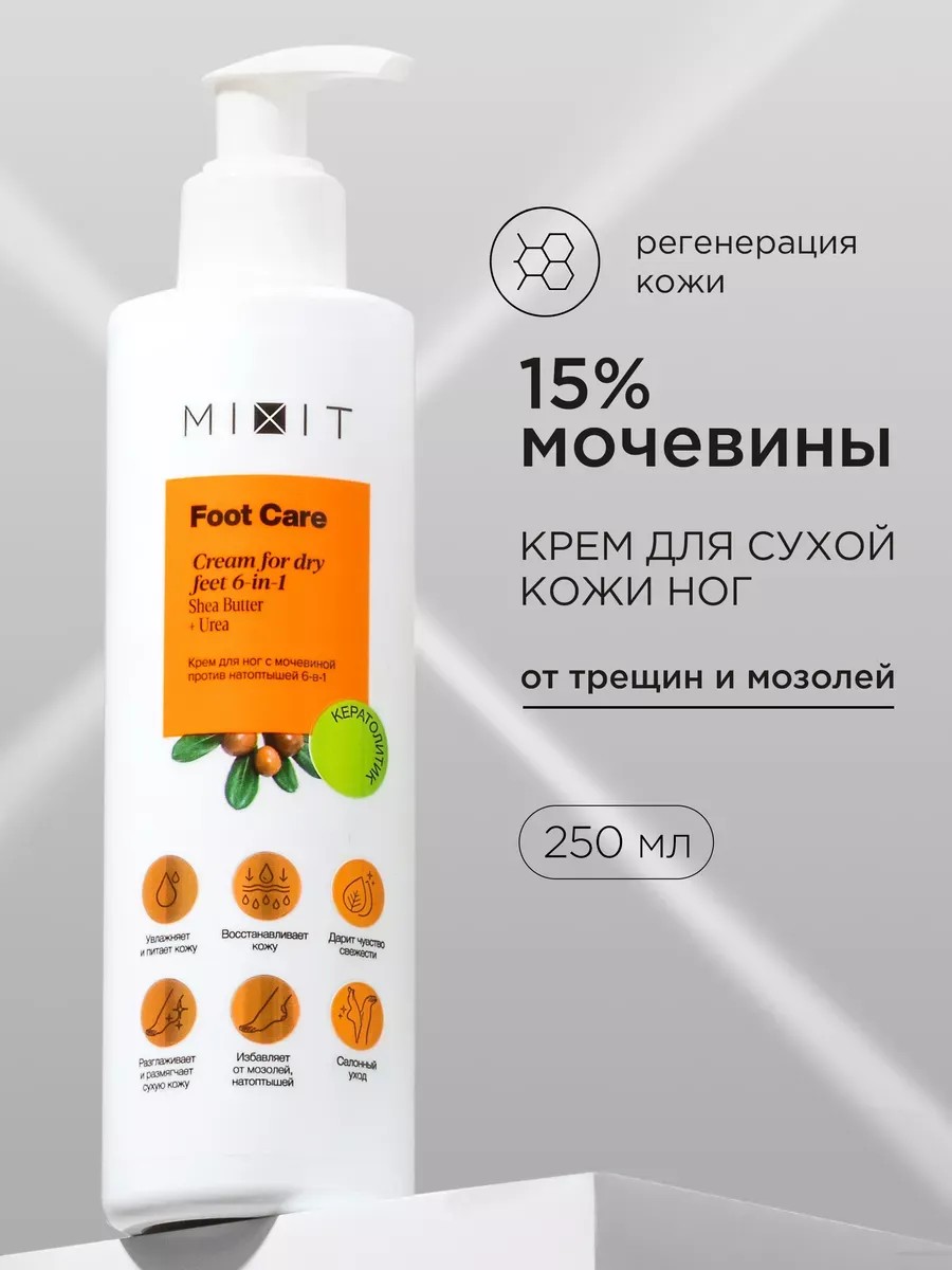 МИКСИТ Увлажняющий крем для ухода за кожей ног с мочевиной и ментолом Foot Care Cream for dry feet 6-in-1. Уходовое средство способствует заживлению трещин, разглаживанию и смягчению, увлажняет и восстанавливает защитный барьер. Лимфодренажный крем снимает ощущение усталости после тяжелого дня, оказывает профилактику от трещин и натоптышей. Заживляющий крем с натуральным составом на водной основе. Один из компонентов – ментол обеспечивает охлаждающий эффект, успокаивает раздражения, покраснения и воспаления. Мочевина обеспечивает увлажнение и восстановление, запускает регенерирующие процессы. Оказывает липидовосстанавливающее действие и успокаивающий эффект. Масло кокоса, авокадо и ши формируют защиту от негативного воздействия внешней среды. Также кокосовое масло делает пяточки гладкими, устраняет трещины. Сос крем с гиалуроновой кислотой обеспечивает смягчающий и антивозрастной эффект. Способ применения: после очищения нанести суперувлажняющий крем для комбинированной кожи. Для лучшего пилинг эффекта рекомендуем использовать восстанавливающую мазь вместе с кератолическим средством гладкие пятки. Результат: отшелушивание и сохранение красоты, разглаживающий зрелую кожу эффект, сияние и от неприятного запаха, идеальная кожа. Легкий омолаживающий крем с авокадо подходит для всех типов кожи: очень сухой и жирной, проблемной кожи и нормальной, чувствительной и обезвоженной, молодой и возрастной, женской и мужской. Питательный крем работает как размягчитель грубой и сухой кожи пяток, как ремувер для удаления кутикулы. Новогодний био подарок для парня подростка, девочек и мальчиков подростков. Дермокосметика для обработки ступней дома как в салоне. Премиум бьюти товары для педикюра. Эко косметика для профессионального ухода за кожей стоп.