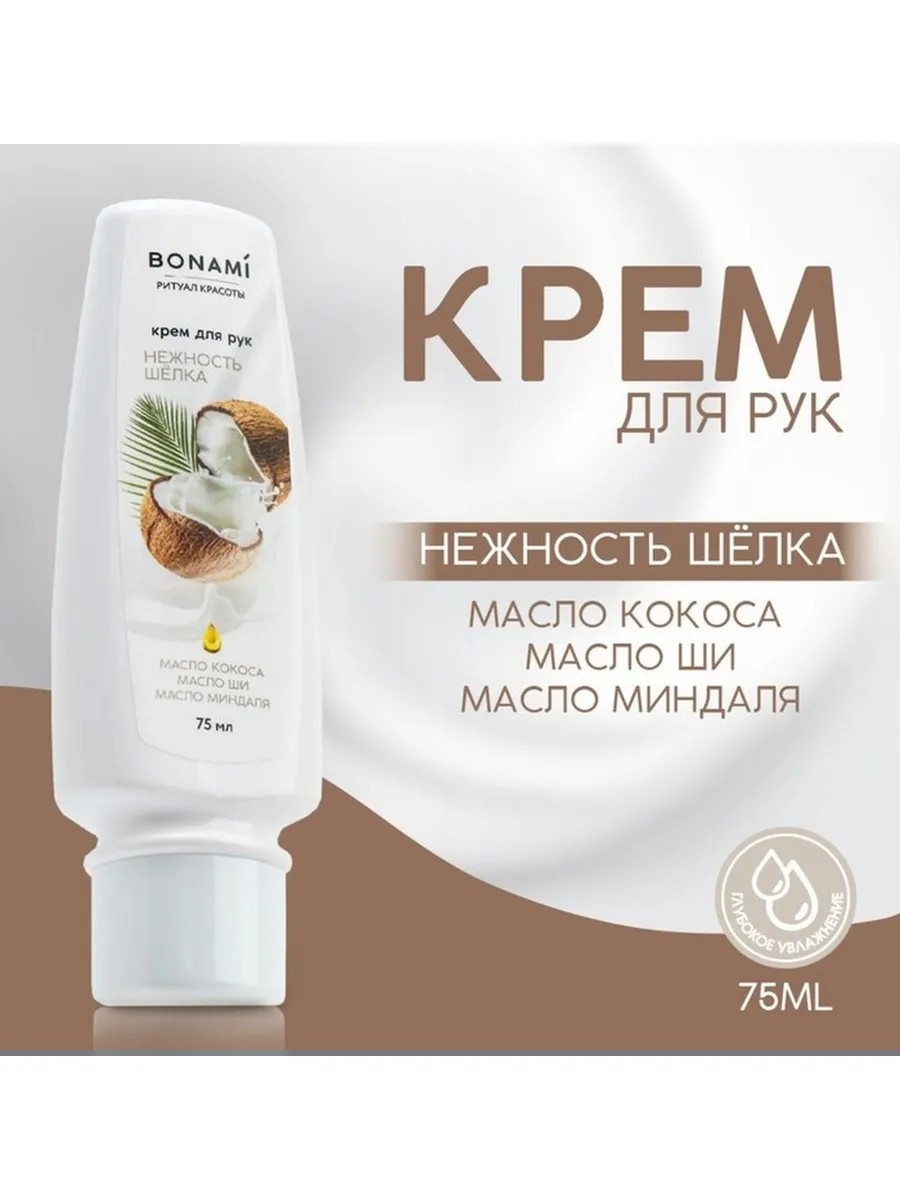 | Комплектация | Крем для рук с маслом кокоса; ши и миндаля; нежность шёлка; 75 мл; BONAMI |