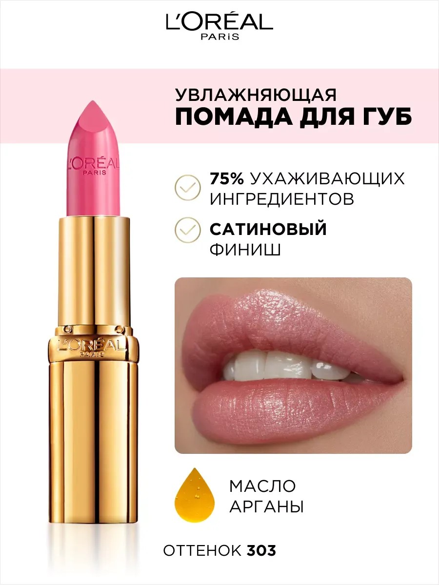 The iconic L'Oreal Paris lipstick since 1985. Color Riche is a combination of rich color pigments and precious oils in one bottle. Satin finish, gliding application, a rich palette of shades. 75% caring ingredients in the formula. Camellia and lotus extracts, argan and jojoba oils deeply nourish and moisturize the delicate skin of the lips. More than color. The luxury of color and care for your lips. The lipstick spreads evenly over the lips due to its light texture. For more intense color and prolonged wear, use with the Color Riche pencil from L'Oreal Paris. Avoid contact with eyes. In case of contact with eyes, rinse thoroughly with water. Luxurious, even color, Protects lips from drying out, Protects lips, Makes lips soft and moisturized. Choose your perfect shade.