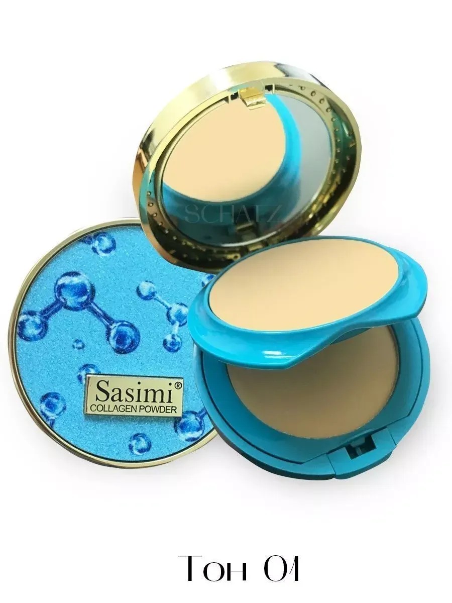 Пудра «Sasimi. Gollagen Powder» 2in1 - легко распределяется по лицу и придает ему сатиновое сияние. Она эффективно справляется с жирным блеском, создавая на коже невидимое шелковое покрытие. Подходит для любого типа кожи и цвета, идеально подстраивается под тон и устраняет недостатки, не забивая поры и не вызывая сухости. Компактная упаковка представлена в двух оттенках и имеет зеркало и спонж для удобного использования. Её дизайн аппелирует к эстетическому зрению благодаря своей ослепительной блистательности с использованием стразов. Помимо этого эта тоналка также матирует и освежает кожу, делая ее гладкой и бархатистой. Она фиксирует макияж, обладает увлажняющим эффектом и способствует более упругой и эластичной коже.Минеральная матирующая энзимная с запасным блоком создаст идеальное матовое покрытие, а рассыпчатая пудра для лица равномерно наносится и отлично закрепляет макияж выравнивает тон лица, контролирует выработку кожного сала и минимизирует блеск.