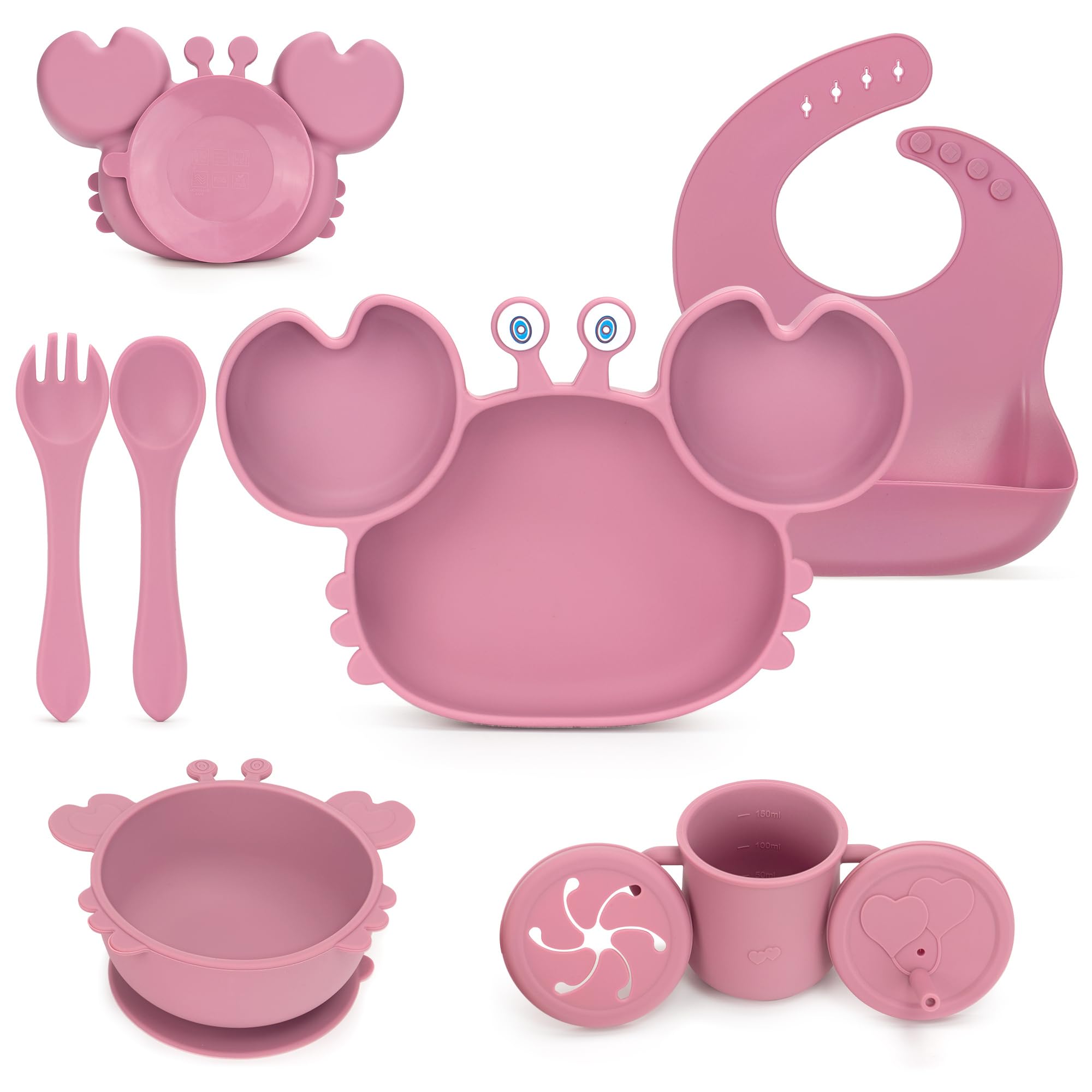 Made of food-safe materialOur baby food set consists of food-safe silicone, is BPA-free and 100 safe for baby.The fork and the spoon of the baby cutlery set are made of complete silicone, is chewy and protects the baby's sensitive gums, does not cause any injuries.The handles are reinforced to make it easier to grasp and absorb food.It is particularly helpful for self -feeding from the youngest eater.Cleaning is a child's playOur children's tableware set is not only practical, but also easy to clean.You can either rinse the children's tableware set under running water, or put them in the dishwasher or even boil with boiling water to clean thoroughly.In addition, the children's tableware set is also suitable for the microwave to warm up the baby's food.Or put the dishes in the fridge to preserve the food.Accompanies the growth of the babyThe adjustable baby bib adapts perfectly to the baby's neck and offer protection against pollution.The large collecting bowl catches any falling food or liquid and reduced disorder.The baby mug has a snack cover and a drinking lid.It is a snack cup, but also a straw cup and open cup!The practical 3-in-1 design helps babies to drink water independently in every phase.Baby dishes with suction cupThe baby plate and the bowl with a large suction cup stick firmly on smooth surfaces such as tables or upholstery and prevent it from falling down or overturning the baby dishes.The little ones can explore their meals to their heart's content without the plate slipping or falling over.The suction cup can be removed quickly and easily and attached again, perfect for every situations such as eating at home, picnic outdoor or when traveling.Crab -shaped divided designWith a cute crab -shaped design, the silicone baby dishes is the perfect companion when eating for your baby.Krabben Baby dishes calls for independence and the learning process in eating and at the same time enjoys the joy of eating.Silent design with both crab claws and medium areas enables the crab baby plate to prevent mixing and ensure a balanced diet of the baby.Aus lebensmittelechtem MaterialUnser Baby Essen Set besteht aus lebensmittelechtem Silikon, ist BPA-frei und 100 sicher für Baby. Die Gabel und der Löffel des Baby Besteck Sets sind aus vollständigem Silikon hergestellt, ist kaubar und schont das empfindliche Zahnfleisch des Babys, verursacht keine Verletzungen. Die Griffe sind verstärkt, um das Greifen und Aufnehmen von Speisen zu erleichtern. Es ist besonders hilfreich für die Selbstfütterung von dem jüngsten Esser. Reinigung ist ein KinderspielUnseres Kindergeschirr Set ist nicht nur praktisch, sondern auch leicht zu reinigen. Sie können das Kindergeschirr Set entweder unter fließendem Wasser abspülen, oder in die Spülmaschine geben oder sogar mit kochendem Wasser abkochen, um gründlich zu reinigen. Darüber hinaus ist das Kindergeschirr Set auch für die Mikrowelle geeignet, um das Essen des Babys aufzuwärmen. Oder stellen Sie das Geschirr in den Kühlschrank, um die Lebensmittel zu konservieren. Begleitet das Wachstum des BabysDas verstellbare Babylätzchen passt sich perfekt an den Hals des Babys an und bieten Schutz vor Verschmutzung. Die große Auffangschale fängt jegliche herabfallende Nahrung oder Flüssigkeit auf und reduzierte Unordnung. Der Baby Becher verfügt über einen Snack-Deckel sowie einen Trinkhalmdeckel. Es ist ein Snackbecher, sondern auch ein Strohhalmbecher und offener Becher! Das praktische 3-in-1-Design hilft Babys in jeder Phase, selbständig Wasser zu trinken. Baby Geschirrset mit SaugnapfDer Babyteller und die Schüssel mit großem Saugnapf haften fest an glatten Oberflächen wie Tischen oder Hochstühlen und verhindern so ein Herunterfallen oder Umkippen des Baby Geschirrset. Die Kleinen können können nach Herzenslust ihre Mahlzeiten erkunden, ohne dass die Platte verrutscht oder umfällt. Der Saugnapf kann schnell und einfach abgenommen und wieder angebracht werden, perfekt für jede Situationen wie Essen zu Hause, Picknick im Freien oder auf Reisen. Krabbenförmiges Unterteiltes DesignMit niedlichem krabbenförmigem Design ist das Silikon Baby Geschirrset den perfekten Begleiter bei dem Essen für Ihr Baby. Krabben Baby Geschirrset fordert die Unabhängigkeit und den Lernprozess beim Essen und lässt Ihr Baby gleichzeitig die Freude am Essen genießen. Unterteiltes Design mit beiden Krabbenklauen und mittlerem Bereich ermöglicht dem Krabben Babyteller, eine Vermischung zu verhindern und eine ausgewogene Ernährung des Babys gewährleistet.MOJINL Silikon Baby Geschirrset mit Saugnapf, BPA Frei Kindergeschirr Set,8 Stück Baby Besteck Set mit Baby Teller Löffel Gabel Schüssel Lätzchen Snack Becher Trinklernbecher für Baby Mädchen Junge Rosa