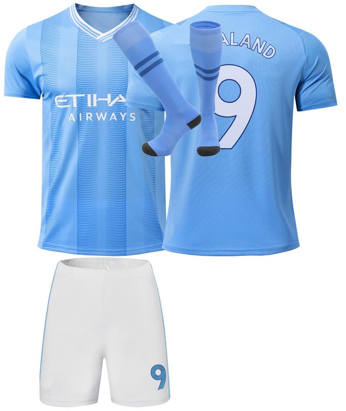 Mokiss Erling #9 Blue Kids Jersey Football New Season Shorts Socks Youth Sizes 26 (8-9 Years) Home