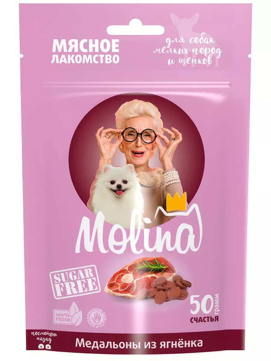 Molina лакомство для собак мелких пород Медальоны из ягненка, 50 г. Вкусный и натуральный продукт? Легко жуется и обладает высокими питательными свойствамиИдеально для тренировки, закрепления полезных навыков, поощрения и перекусаПо содержанию незаменимых аминокислот, витаминов, белка и минеральных веществ мясо ягненка не уступает говядине, в нем содержится цинк, необходимый для иммунной системы организмаУдовлетворяет естественный жевательный инстинкт Вашей собакиСовременная упаковка и многоразовая застежка zip-lock удобны в использовании и длительном хранении Состав: баранина - 93,8%крахмал - 2%пищевые добавки - 4%соль - 0,2%Пищевая ценность: белок - 30%жир - 5,5%клетчатка - 0,2%зола - 4%влажность - 23%.