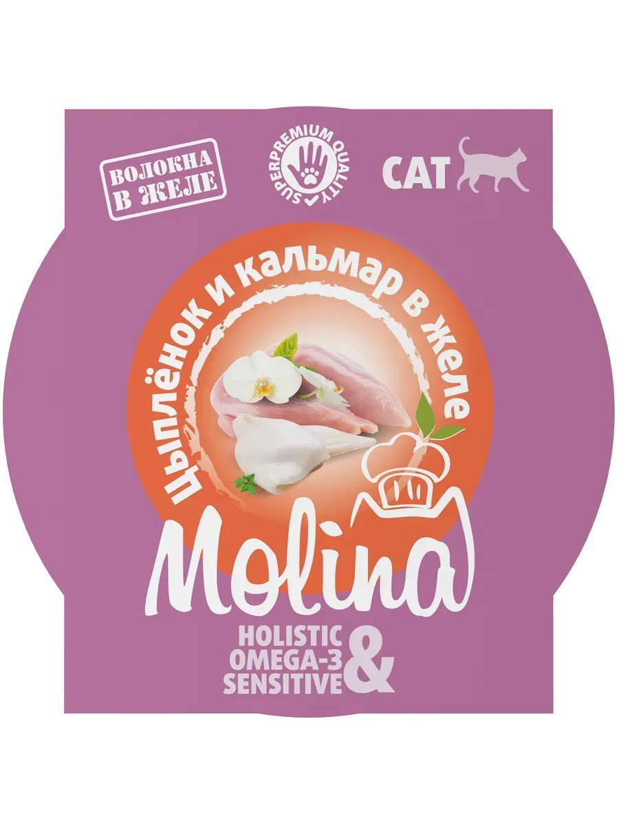 Корм Molina Holistic (в желе) для кошек, цыпленок и кальмар, 75 г. Морское удовольствие в удобной порции консервированного корма мясо цыпленка с кальмаром в ароматном желе. Дополнен фукусом, который способствует детоксикации организма и укрепляет защитные силы. Преимущества: ингредиенты премиального качества поддерживает здоровье ЖКТ и иммунной системы высокое содержание животного белка отличная альтернатива однообразным кормам. Состав: Грудка цыпленка 62 %, кальмар 10 %, экстракт фукуса (бурая водоросль), бульон 26, 8 %, загустители 1, 1 % (каррагинан, гуаровая камедь, ксантановая камедь) Пищевая ценность на 100 г (средние значения) : сырой белок 11, 8 г, сырой жир 1, 1 г, сырая клетчатка 0, 09 г, сырая зола 0, 5 г, влажность 85 %, Омега-6 80 мг, Омега-3 36, 3 мг Энергетическая ценность на 100 г продукта: 64 ккал / 268 кДж.