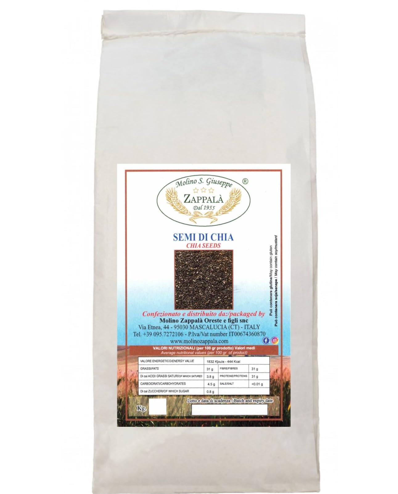 Chia seeds are naturally rich in amino acids necessary for the body's protein formation, including methionine, cysteine, and lysine (excluding taurine), and in antioxidants, present in quantities four times higher than those found in blueberries. Expires approximately 120 days after ordering. Average nutritional values per 100 g: REG. (EU) 1169 2011 Average Value Unit Energy 1832 444 kJ- kcal 100g Fat 31 g 100g of which saturated fat 3.8 g 100g Carbohydrates 4.5 g 100g of which sugars 0.8 g 100g Fiber 31 g 100g Protein 31 g 100g Salt 0.01 g 100g May contain gluten May contain soy