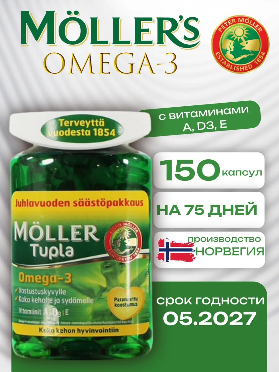 Омега-3 Moller Tupla - популярные в Норвегии и Финляндии витамины с двойным содержанием полиненасыщенных жирных кислот содержат рыбий жир из мяса тушек диких анчоусов и сардин, а также витамины А, Д, Е. РЕКОМЕНДУЕМАЯ ДОЗА: 2-3 капсулы в день, не рекомендуется беременным из-за содержания витамина А. Для производства омеги компания Möller’s использует лучшее сырье из чистых вод Норвегии, что обеспечивает наивысшее качество готового продукта. В продуктах Möller Тупла жирные кислоты находятся в форме триглицеридов и представляют собой естественную форму жира, получаемого с пищей. Прозрачные капсулы рыбьего жира с приятным запахом ванили легко глотать, они растворяются в желудке. Как замечают большинство людей, принимающих рыбий жир, "рыбной отрыжки" после приема не возникает. Финские витамины omega-3 моллер оказывают комплексное влияние на организм: влияют на внешний вид кожи, волос, ногтей, укрепляют иммунитет. Необходимы для укрепления стенок сосудов, работы сердца, упругости суставов. Рыбий жир в капсулах Моллер Тупла препятствует развитию синдрома хронической усталости и депрессий, что особенно важно для женщин 40 и 50 лет. Регулярный прием витаминов omega-3 в капсулах для взрослых поможет избежать простуд, повысить продуктивность, снизить риск сердечно-сосудистых заболеваний, повысить продуктивность. Омега 3 - идеальные женские витамины для красоты кожи и волос. Среди детей наибольшую популярность завоевал рыбий жир в виде жевательных пастилок с фруктовым вкусом Моллер рыбки, которые также есть у нас в каталоге. Будьте здоровы! С уважением и заботой, RUSKEA KARHU.