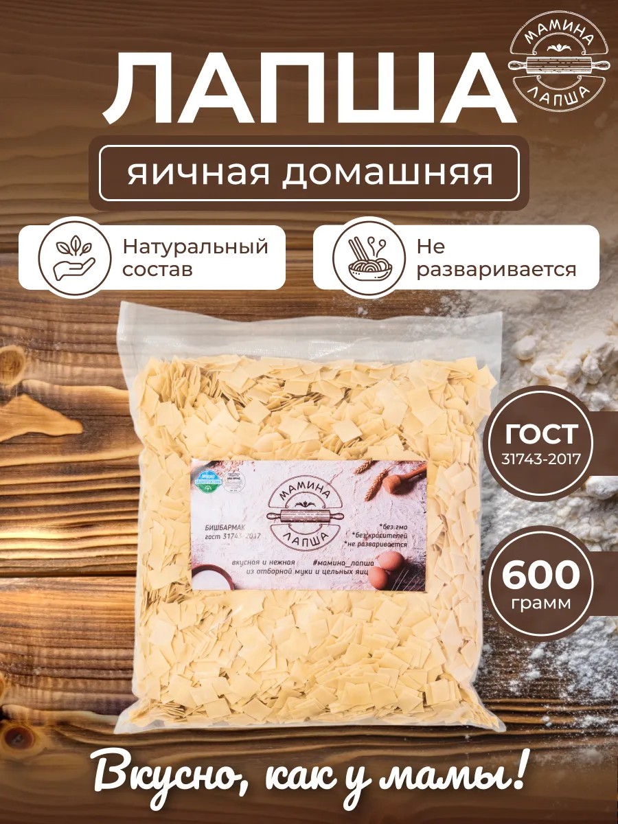 Мы молодое семейное предприятие производящие домашнюю лапшу под брендом «Мамина Лапша». Вся наша продукция выпускается на новом оборудовании по авторской рецептуре из отборной муки высшего сорта и цельных яиц. Сушка лапши производится максимально приближенной к естественной, при котором лапша не проходит машинную вакуумную и термическую обработку как макароны или макаронные изделия, что позволяет сохранить естественный натуральный вкус домашней яичной лапши без посторонних привкусов и запахов машинного оборудования. В лапшу не добавляются искусственные добавки в том числе красители или заменители продуктов.