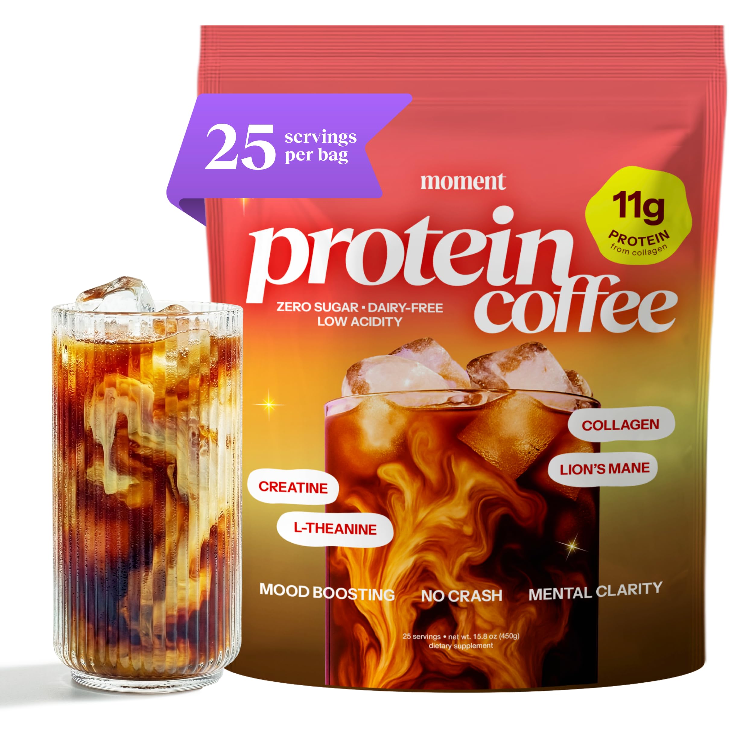 Moment Instant Mushroom Coffee is crafted for anyone wanting a smoother, more functional start to their day. This blend combines Lion's Mane and Reishi mushrooms with premium Arabica instant coffee to support steady energy, focus, and mental clarity—without the jittery feeling of regular coffee. With 11g of protein and collagen peptides, it also helps support hair, skin, nails, joints, and daily wellness, offering a nourishing upgrade to typical mushroom coffee or collagen coffee options. Designed as a clean alternative to heavy, high-acid brews, this low-acidity, zero-sugar, dairy-free coffee mixes instantly into hot or iced drinks for a creamy, satisfying cup. Creatine monohydrate adds an extra layer of functional support for strength, stamina, and daily performance, making this formula a unique choice among mushroom coffee blends, collagen mushroom coffees, and lion's mane mushroom coffees on the market. Whether you're looking for instant mushroom coffee for focus, a collagen protein coffee to support wellness, or a protein coffee powder that fits easily into busy mornings, Moment brings everything together in one scoop. It's a simple way to enjoy coffee with collagen and functional mushrooms while supporting clarity, balance, and overall vitality. Ideal for wellness routines, fasting windows, keto lifestyles, or anyone wanting a better-for-you coffee option that tastes like the real thing—just cleaner, smoother, and more supportive from the inside out.Low-Acid Coffee That Fits Your Day: Enjoy a smoother cup made with low-acidity Arabica instant coffee that's easier on digestion. Perfect for busy mornings, pre-workout energy, afternoon focus, fasting windows, or on-the-go use — a clean, zero-sugar, dairy-free collagen protein coffee that fits any routine. Mental Clarity: Lion's Mane and Reishi support clear thinking, creativity, and a centered mindset. This mushroom focus coffee offers reliable cognitive support without excess caffeine or the acidic feel of regular coffee — an easy way to add functional mushrooms to your daily routine. Strength Performance Support: Fuel your routine with a protein coffee powder powered by creatine monohydrate to support strength, stamina, and everyday performance. A unique upgrade over typical lion's mane mushroom coffee, combining protein, collagen, functional mushrooms, and instant coffee in one scoop. Daily Wellness for Hair, Skin Joints: Support beauty and joint health with collagen peptides and additional protein in every scoop. This collagen mushroom coffee mixes instantly into hot or iced drinks for a creamy, zero-sugar, dairy-free boost — ideal for customers looking for coffee with collagen and a more functional start to their day. Energy, Focus Protein: Start your day with calm, steady energy and sharper focus from a lion's mane mushroom coffee enhanced with 11g of protein. Natural caffeine, Reishi, and L-Theanine support clarity without jitters, while the added protein helps keep you fueled through the morning — a clean upgrade to traditional mushroom coffee blends.