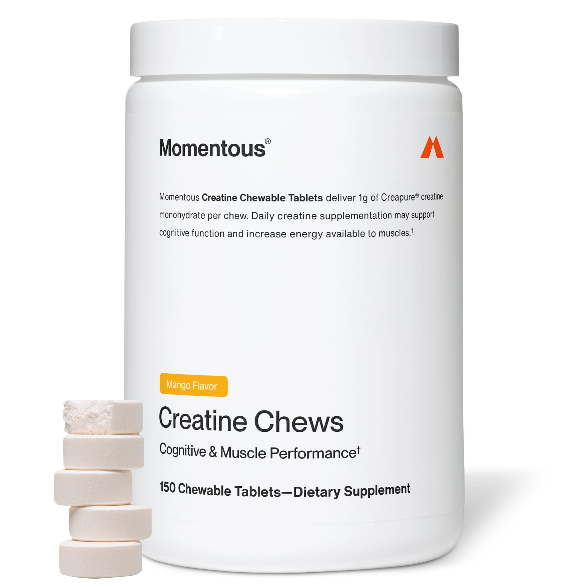 Momentous Creatine Chews - Creapure Creatine Monohydrate - Supports Strength, Lean Muscle, & Recovery for Men & Women - NSF Certified for Sport - 150 Chewable Tablets - Mango