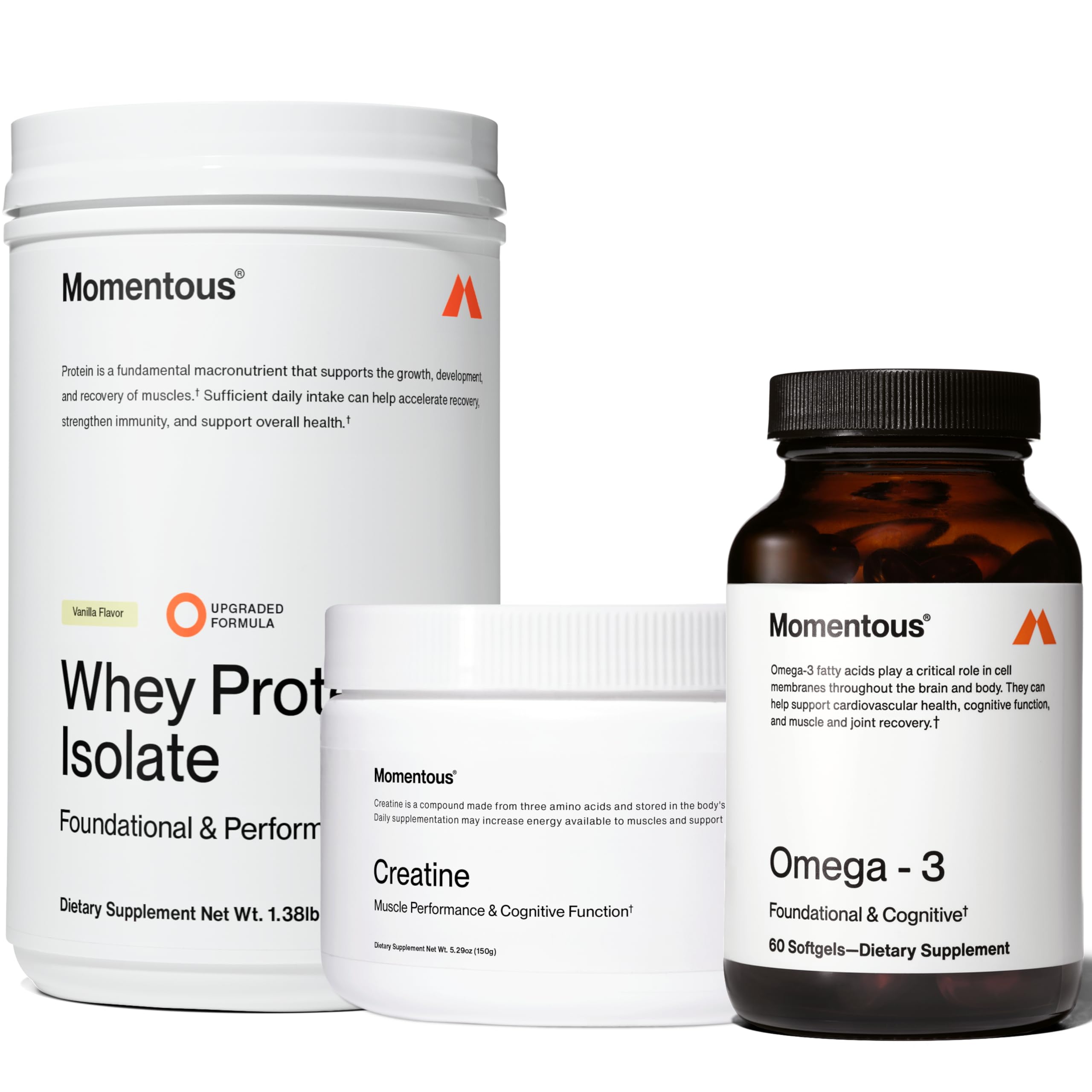 Support Cognition - Give your brain a boost with Momentous omega-3 fish oil supplements (30 servings) which can enhance cognitive function. Momentous omega-3 fish oil capsules contain 1,600 mg of combined EPA DHA in a 1:1 ratio with no fishy aftertaste. Build Lean Muscle - Fuel your fitness journey with Momentous essential grass-fed whey vanilla protein powder (25 servings), designed to support muscle repair growth. Sourced from grass-fed European dairy cows, it provides the essential amino acids your body needs for recovery after intense workouts. Build Lean Power - Help elevate your workout results with Momentous creatine monohydrate powder (30 servings) for men women. It helps enhance post-exercise protein synthesis, fostering the growth of lean muscle mass quicker recovery times. Excellent solubility zero taste. Protein aids muscle repair immune support, creatine boosts physical strength brain energy, omega-3s help support joint brain health. Together, they work synergistically to power both mind body at the cellular level. The Momentous Three combines protein, creatine, omega-3 - three essential nutrients shown to support long-term health, performance, cognitive function. This trio forms the foundation of daily supplementation for athletes, high performers, anyone looking to improve energy, recovery, mental clarity, giving performance for life.