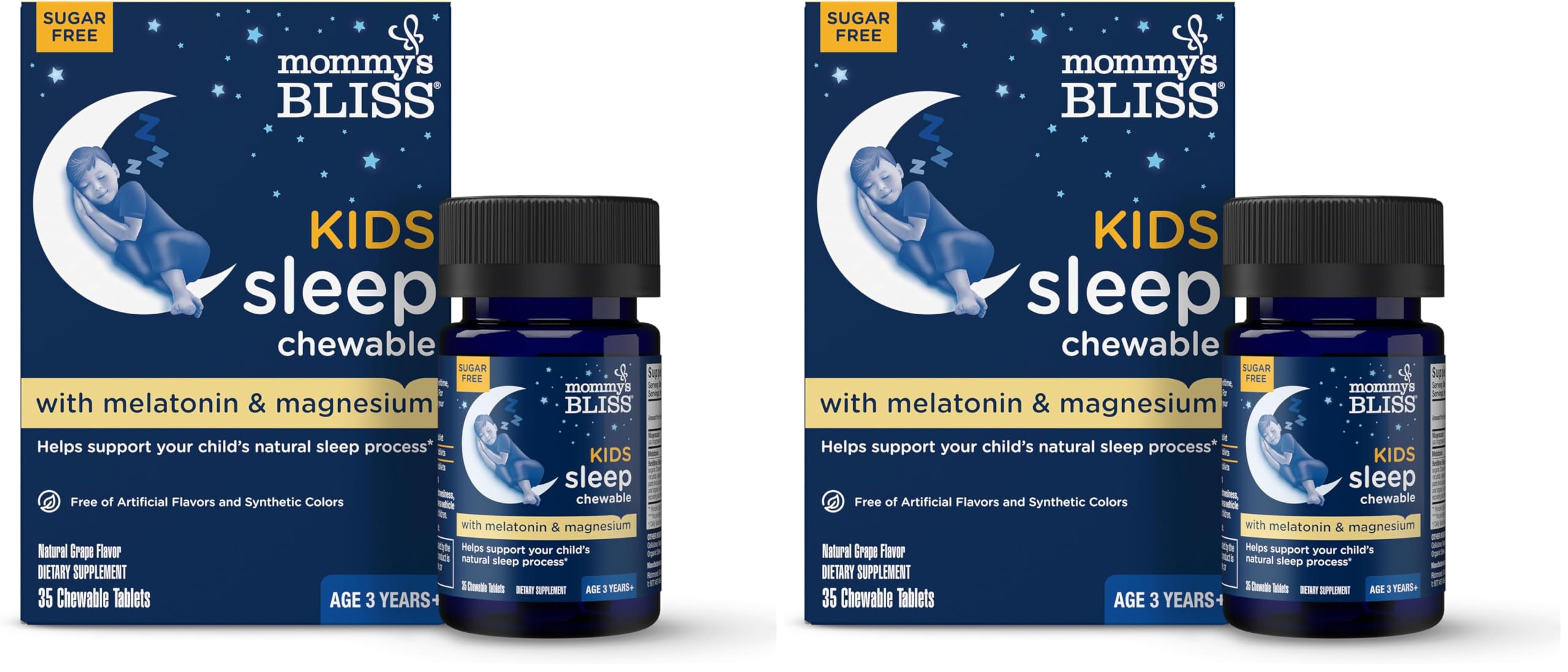 Mommy's Bliss Kids Sleep Chewable Tablets with Melatonin, Calming Herbs, and Magnesium are formulated to help support your child's natural sleep process. These non-habit forming chewable tablets contain a proprietary blend of other ingredients, too this includes organic chamomile, organic lemon balm, organic passionflower. (They are also free of artificial colors and flavors, sugar, drugs, and binders and fillers.) Created for moms, by moms, Mommy's Bliss was created to safely and gently bring families back to bliss.Children Melatonin Sugar-Free Tablets, Free of Artificial Colors and Flavors, Gelatin, Filler, Top 8 Allergens: We believe simpler is better. That means in everything we make, we include only what you or your child needs and never anything they don't. Kid-Approved Taste: We've created our kid melatonin tablets with a delicious grape flavor and easy-to-chew texture that make it for an enjoyable nighttime treat for kids. Our melatonin tablets for kids are recommended for children 3 years and up. Non-habit Forming Solution to Kids Sleep: Our drug-free kids melatonin chewable tablets are sugar-free and contain melatonin, calming herbs, and magnesium - to work with your child's natural sleep process and help promote restful sleep . Mom Designed Peace of Mind: Mommy's Bliss was founded by Roshan Kaderali, a mom and pediatric nurse, midwife and doula, on a mission to help moms bond with their babies with trusted products, like this children's melatonin, with wise ingredients. Melatonin for Kids with Quality Ingredients: Our Bedtime Bliss Blend of organic chamomile, organic lemon balm, and organic passion flower have been carefully selected to safely help promote restful sleep in children, so they wake up feeling rejuvenated. The information below is per-pack only.