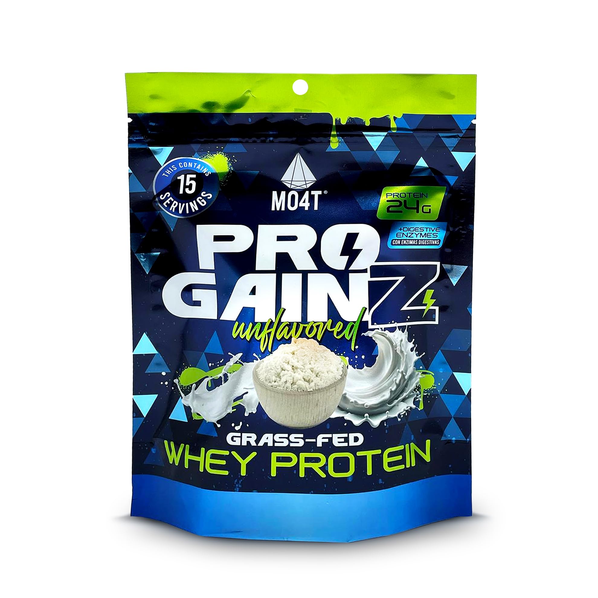 Elevate your fitness journey with MO4T ProGainz, the ultimate protein source for active lifestyles. Whether you're hitting the gym or fueling recovery, this grass-fed whey protein powder is crafted for excellence. Available in Vanilla and Unflavored, ProGainz fits seamlessly into your routine—mix it into shakes, bake with it, or enjoy it as a quick snack.PROUDLY MADE IN THE USA: small bussiness, sports nutrition in Florida. Enhanced with Patented Digestive Enzymes: Contains DigeZyme, a unique blend of amylase, protease, lactase, lipase, and cellulase enzymes. These enzymes support better digestion, nutrient absorption, and gut health, reducing bloating and discomfort after protein intake. Thanks to DigeZyme, MO4T ProGainz is not only low-carb and gluten-free but also easy to digest, making it suitable for sensitive stomachs. Convenient 15-Serving Size: Compact, one-pound bags make it easy to stay stocked without committing to a bulky container. Low Carb Gluten-Free: Designed for active lifestyles, MO4T ProGainz is low-carb, gluten-free, and ideal for anyone pursuing fitness goals, from weight loss to muscle gain. High Protein Content: Each serving delivers 24 grams of protein, supporting lean muscle growth, post-workout recovery, and healthy weight management. Grass-Fed Pure: Made with premium whey protein from grass-fed cows, free from hormones and impurities. Every scoop provides a clean source of essential protein for muscle recovery, strength, and overall health.