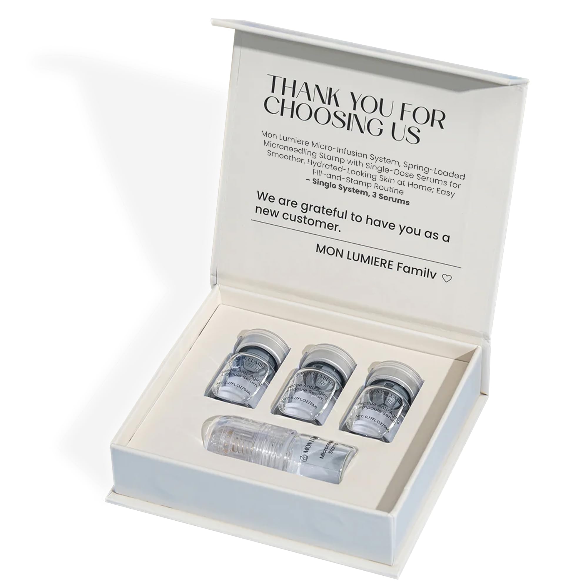 Mon Lumiere Micro-Infusion System - 0.25mm Gold Derma Spring-Loaded Stamp with PDRN & Peptides - At-Home Facial Kit for Collagen Boost & Fine Lines - Includes 3 Single-Dose Serums - Starter Kit 1 Month Plan( Pack of 3)