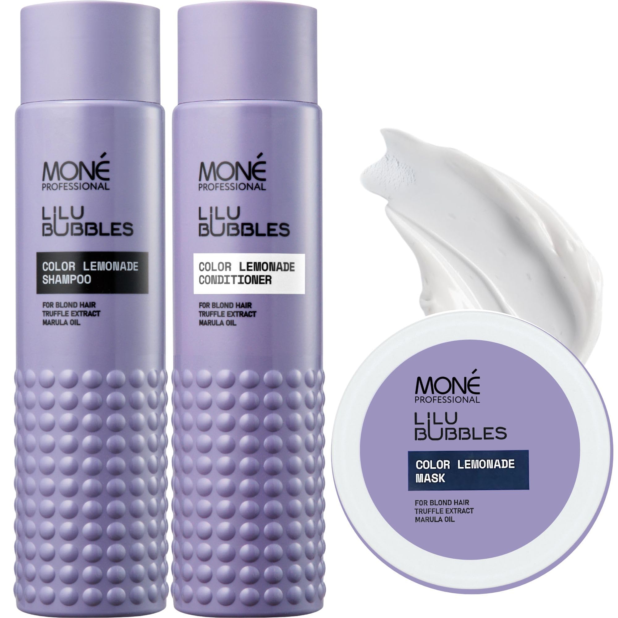 Pamper your hair with the Lilu Bubbles Color Lemonade Set from Mone Professional, specially developed for blond, bleached, gray and general light hair. The care set consists of a mild shampoo, a nourishing conditioner and an intensive mask. Shampoo and conditioner are suitable for daily use and gently cleanse the hair without weighing it down. Once or twice a week, replace the conditioner with the rich mask to give your hair an extra boost of suppleness and vitality. Unlike conventional purple or silver products, this set provides natural brightness without discoloring and gives the hair a fresh, radiant shine. Enriched with a fruity scent and professional active ingredients, your hair looks visibly healthier, softer and full of life. INSTRUCTIONS FOR USE Wash damp hair: Apply some shampoo in your hands and sprinkle it over your hair. Massage it into your scalp and wash your hair thoroughly. Repeat as necessary. Conditioning: After washing your hair, apply some conditioner to your hands and sprinkle it over your hair. Leave it on for a few minutes and wash your hair thoroughly. Mask: Once or twice a week, replace the conditioner with the mask. Spread an amount of mask in your hands and sprinkle it over your hair. Leave it on for a few minutes and wash your hair thoroughly. SAFETY WARNING For external use only. Keep out of the reach of children. Avoid contact with the eyes. Do not take. Discontinue use if irritation occurs. See moreComplete hair care Trio: contains Color Lemonade shampoo, conditioner and mask for a complete routine.MONÉ Professional Haarverzorgingsroutine voor dagelijks gebruik, shampoo, conditioner en masker voor blond, geblondeerd, grijs en licht haar, kleurvast, niet paars, hydraterend en lichter Verwen je haar met de Lilu Bubbles Colour Lemonade Set van Mone Professional, speciaal ontwikkeld voor blond, geblondeerd, grijs en algemeen licht haar. De verzorgingsset bestaat uit een milde shampoo, een verzorgende conditioner en een intensief werkend masker. Shampoo en conditioner zijn geschikt voor dagelijks gebruik en reinigen het haar zachtjes zonder het te verzwaren. Een tot twee keer per week vervang je de conditioner door het rijke masker om je haar een extra boost aan soepelheid en vitaliteit te geven. In tegenstelling tot conventionele paarse of zilveren producten zorgt deze set voor natuurlijke helderheid, zonder te verkleuren en geeft het haar een frisse, stralende glans. Verrijkt met een fruitige geur en professionele werkzame stoffen ziet je haar er zichtbaar gezonder, zachter en vol leven uit. GEBRUIKSAANWIJZING Vochtig haar wassen: Smeer een hoeveelheid shampoo in je handen en strooi het over je haar. Massageer het in je hoofdhuid en was je haar grondig. Herhaal als nodig. Conditioneren: Na het wassen van je haar, smeer een hoeveelheid conditioner in je handen en strooi het over je haar. Laat het een paar minuten inwerken en was je haar grondig. Masker: Een tot twee keer per week, vervang je de conditioner door het masker. Smeer een hoeveelheid masker in je handen en strooi het over je haar. Laat het een paar minuten inwerken en was je haar grondig. VEILIGHEIDSWAARSCHUWING Alleen voor uitwendig gebruik. Buiten het bereik van kinderen bewaren. Vermijd contact met de ogen. Niet innemen. Stop het gebruik bij irritatie. Meer bekijkenComplete haarverzorging Trio: bevat Colour Lemonade shampoo, conditioner en masker voor een volledige routine.