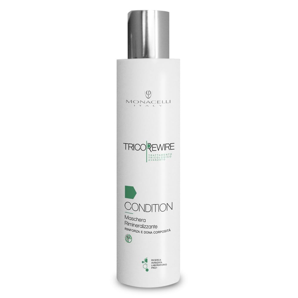 Thanks to its exclusive active ingredients that work synergistically, the TricoRewire treatment successfully recreates the Rewire bonds between the different structures (bulb, sebaceous gland, arthroscopic muscle) involved in homeostasis and the regulation of the overall functions of the hair follicle. It restores the skin's ecosystem, reactivates the vital functions of the hair root, and reconnects the regulatory mechanisms of the hair's life cycle. The Monacelli Remineralized Conditioning Mask makes the hair shaft elastic, strengthened, and protected thanks to its exclusive multi-complex of moisturizers. Your hair will be stronger, more elastic, and shinier. Suitable for fragile, fine, and dull hair. Used as at-home maintenance for the TricoRewire treatment performed in the salon. Safe and effective on both natural and color-treated hair.Monacelli Italy, with over 25 years of experience, has revolutionized salon development with a unique method that combines product quality, service excellence, and innovative management. This approach has created an environment where clients feel truly valued and professionals are supported in achieving their goals. At the heart of the company is a passionate team that cultivates talent every day, always striving for excellence. The TricoRewire treatment re-establishes connections between the structures involved in homeostasis and the regulation of hair follicle function. It restores the skin's ecosystem and reactivates vital root functions. The Senergy Complex balances proper hair follicle function and strengthens hair, BioZIN 3 protects against free radicals and slows the skin aging process, and MicroBOOST promotes the restoration of microcirculation. It is used as at-home maintenance for the TricoRewire treatment performed in the salon. Safe and effective on both natural and color-treated hair. Makes the hair shaft elastic, strengthened, and protected thanks to its multi-complex hydration formula. Your hair will be stronger, more elastic, and shinier. For fragile, fine, and dull hair. Monacelli Tricorewire Conditioning Remineralizing Mask is a cream that strengthens hair and adds body.Le traitement TricoRewire, grâce aux principes actifs exclusifs qui travaillent en synergie, réussit à recréer des liaisons - Rewire - entre les différentes structures (bulbe, glande sébacée, muscle pilo érectiteur) qui sont impliquées dans l'homéostasie et la régulation des fonctionnalités globales du follicule pileux. Restaure l'écosystème cutané, réactive les fonctions vitales de la racine du cheveu, relie les mécanismes de régulation du cycle de vie. Condition Masque reminéralisé Monacelli rend la tige élastique, renforcée et protégée grâce au multi complexe hydratant exclusif. Vos cheveux seront plus forts, plus élastiques et lumineux. Indiqué pour cheveux fragiles, fins et ternes Utilisé comme entretien à domicile du traitement TricoRewire effectué en salon. Sûr et efficace aussi bien sur les cheveux naturels que sur les cheveux colorés.Monacelli Italy, avec plus de 25 ans d'expérience, a révolutionné le développement des salons grâce à une méthode unique qui combine qualité des produits, excellence dans les services et gestion innovante. Cette approche a permis de créer un environnement où les clients se sentent vraiment mis en valeur et les professionnels soutenus dans la réalisation de leurs objectifs. Au cœur de l'entreprise se trouve une équipe passionnée qui traite chaque jour le talent des gens, en visant toujours l'excellence. Le traitement TricoRewire, recrée des liens entre les structures impliquées dans l'homéostasie et la régulation des fonctionnalités du follicule pileux. Restaure l'écosystème cutané, réactive les fonctions vitales de la racine. Le Senergy Complex équilibre la bonne fonctionnalité du follicule pileux et renforce les cheveux, le BioZIN 3 protège des radicaux libres et ralentit le processus de vieillissement cutané et le MicroBOOST favorise la restauration de l'activité de la microcirculation. Utilisé comme entretien à domicile du traitement TricoRewire effectué en salon. Sûr et efficace aussi bien sur les cheveux naturels que sur les cheveux colorés. Rend la tige élastique, renforcée et protégée grâce au multi-complexe hydratant. Vos cheveux seront plus forts, plus élastiques et lumineux. Pour cheveux fragiles, fins et ternes. Tricorewire Condition Masque reminéralisant Monacelli est une crème qui renforce le cheveu et apporte du corps.Monacelli Tricorewire Condition Masque Cheveux Reminéralisant 200 ml renforce et donne corps pour cheveux cassants fins et ternes