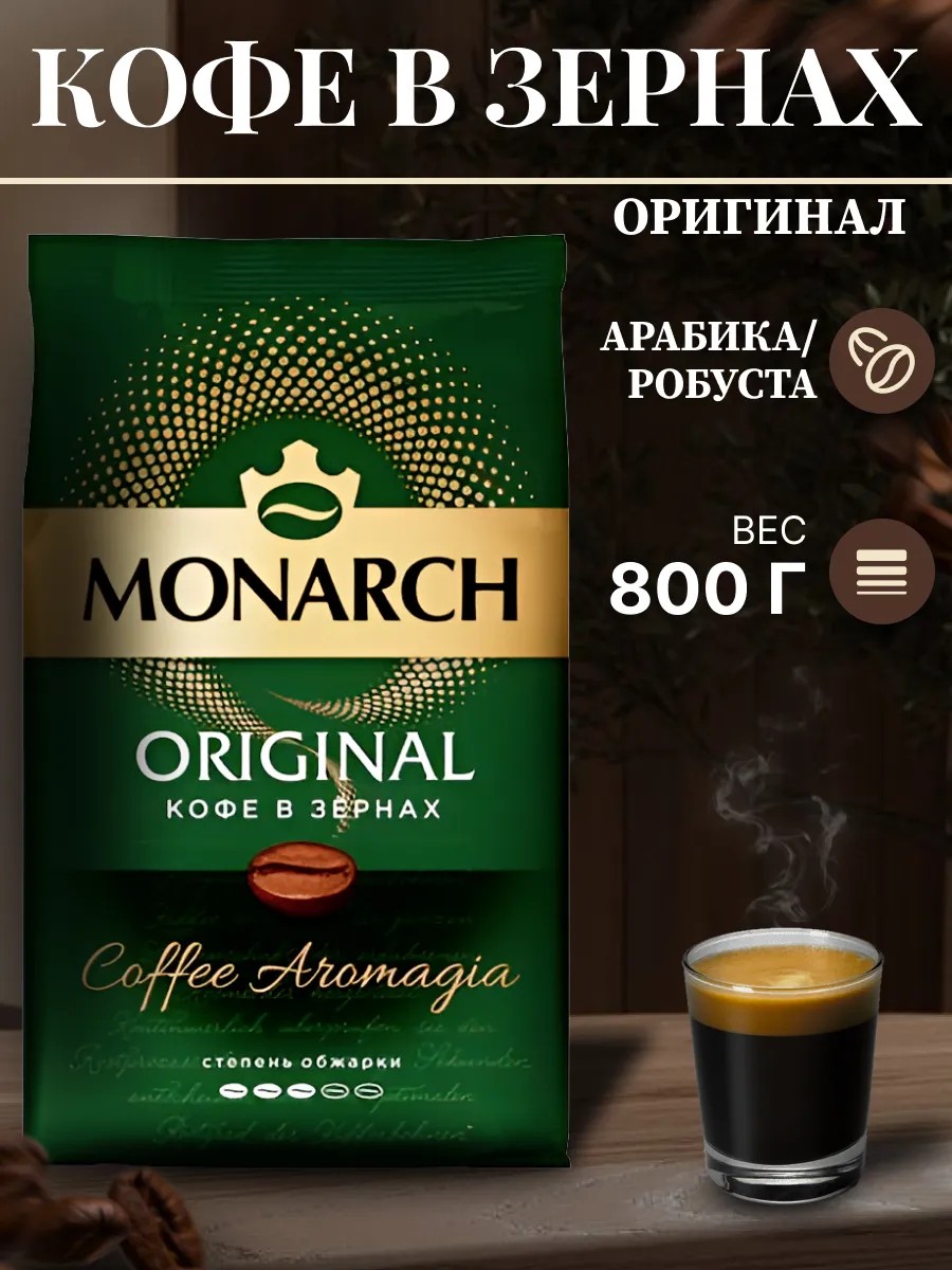 Комплектациякофе; кофе в зернах; кофе зерновой; кофе арабика; кофе арабика робуста; кофе для кофемашины; арабика 100%; кофе в подарок; Кофе Монарх в зернах; Монарх зерновой; Монарх зерна 800г; Монарх оригинал зерна