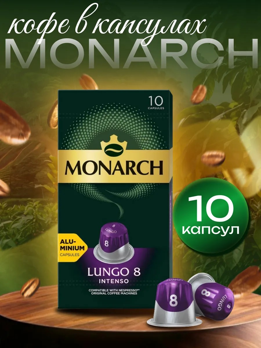 Кофе в капсулах Monarch Lungo 8 Intenso натуральный жареный молотый, 10 капсул. Богатый, насыщенный вкус и волшебная сила Аромагии остаются с вами в каждой чашке кофе Monarch! Мы сохраняем традиции отбора кофейных зерен высокого качества и мастерство обжарки, чтобы продолжать дарить вам богатый насыщенный вкус и аромат кофе. Кофе Monarch – великолепный вкус в каждой капле!