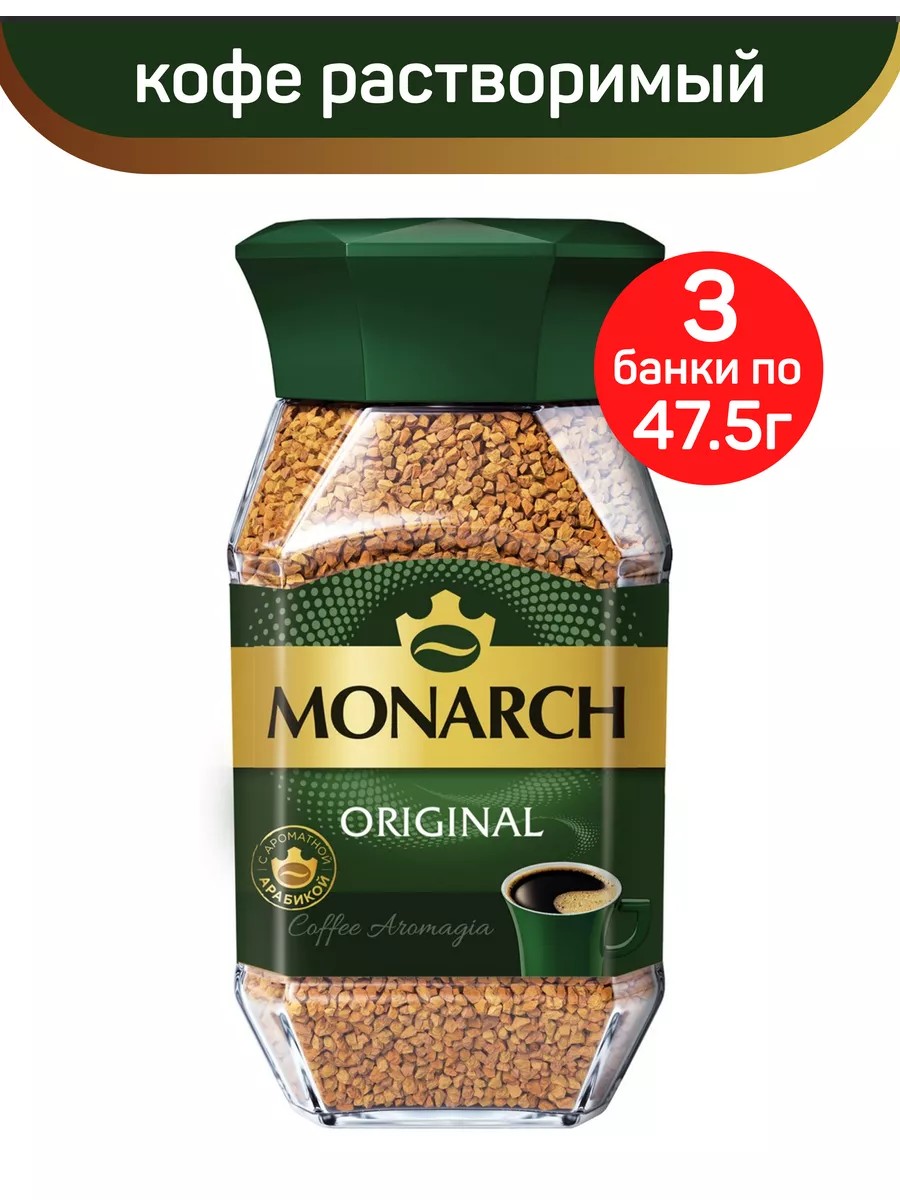 Кофе растворимый Якобс Монарх, 3 банки по 47.5г. Растворимый кофе Monarch обладает богатым вкусом и притягательным ароматом, благодаря искусному сочетанию отборных кофейных зёрен и глубокой обжарке. Дома или в дороге, вы всегда сможете насладиться безупречным вкусом, благодаря легкости приготовления. Просто добавьте горячую воду к любимому кофе и наслаждайтесь Аромагией Monarch