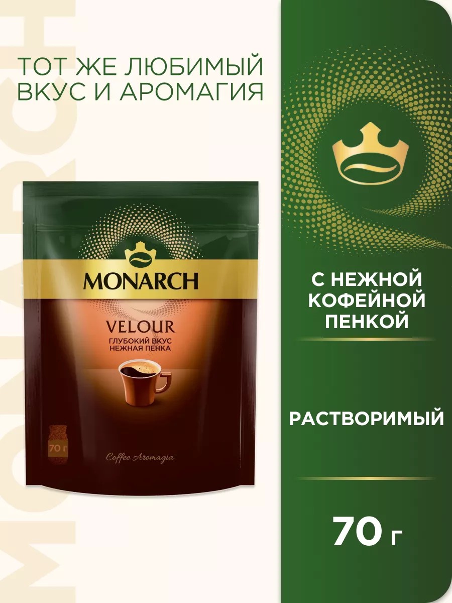 Богатый, насыщенный вкус и волшебная сила Аромагии остаются с вами в каждой чашке кофе Monarch! Мы сохраняем высокое качество и традиции производства, чтобы вы всегда могли наслаждаться любимым кофе. Кофе Monarch Velour – это растворимый кофе с нежной кофейной пенкой. Он сочетает в себе разные черты: глубокий вкус, с которым вы можете ощутить прилив сил, и нежную кофейную пенку, которая сделает вашу чашечку кофе ещё более приятной.