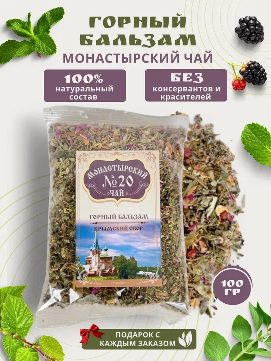Монастырский травяной чай №20 Горный бальзам. Применяется при бронхите, астме, ангине, кашле, гриппе, ОРЗ, обмене веществ, тонизирующий чай. Способ применения:1 столовая ложка на стакан кипятка, настоять и пить как чай. Длительность приема не ограничена. Для заваривания сбора подойдет стеклянный чайник, гайвань (кружка с крышкой), типод (типот) или гунфу чайник и тд. Пить травяной напиток можно из любой любимой посуды кружка, чашка, пиала, стакан, фужер и тд. Суперфуд рекомендован при проблемах перечисленных выше. Тем кто любит чай в пакетиках, листовой чай и даже кофе крымский травяной сбор Горный бальзам будет полезной (зож) и вкусной заменой. Будьте здоровы.