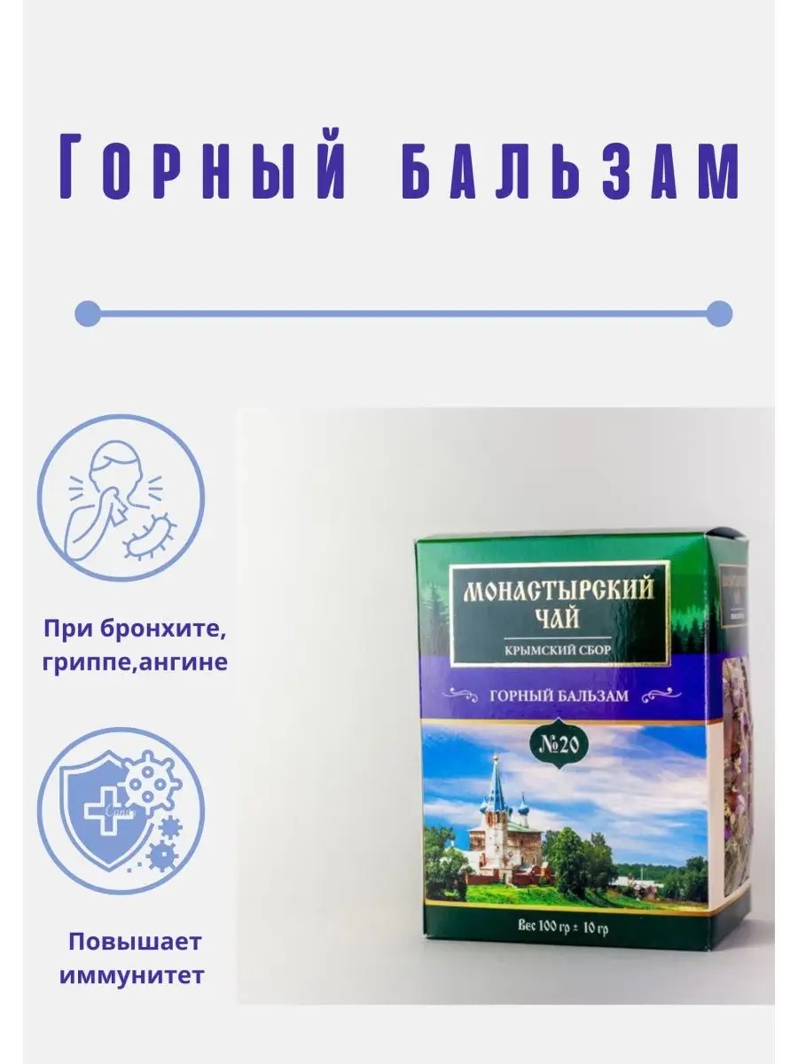 Горный бальзам применяется при бронхите, гриппе, ангине, нарушении обмена веществ, в качестве общеукрепляющего средства, для повышения иммунитета.Ежевика в составе сбора обладает противовоспалительными, антиоксидантными и антибактериальными свойствами, помогая бороться со множеством заболеваний.Душица помогает избавиться от кашля с мокротой, обладает мягкими противовоспалительными свойствами.Отвары из цветков бузины используются в качестве отхаркивающего и жаропонижающего средства с общеукрепляющим эффектом.Можжевельник **ликвидирует воспаление легочной и бронхиальной ткани, улучшает сердечную деятельность. Нормализует кровообращение, артериальное давление.**Чабрец помогает бороться со стрессами и укрепляет иммунитет.Благодаря содержащимся флавоноидам, травяной сбор оказывает иммуностимулирующее, общеукрепляющее и тонизирующее действие.Способ применения: 1 столовую ложку сбора залить 250 мл кипятка,настоять 15-20 мин, пить как чай в течение дня.