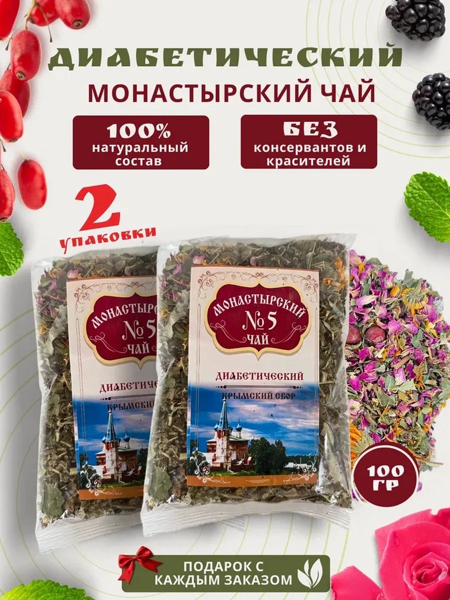 Монастырский чай №5 диабетический снижает уровень сахара в крови, повышает иммунитет, улучшает обмен веществ. СОСТАВ:козлятник,ежевика,мелисса,боярышник(цветы и плоды),роза,мята,стевия,лещина,репешок,барбарис,календула,шелковица,кизил,арония. СПОСОБ ПРИМЕНЕНИЯ: 1 столовая ложка сбора на стакан кипятка, настоять и пить как чай. Курс приема не менее месяца. Для заваривания подойдет любимая кружка, чайник или любая удобная посуда. Напиток состоит из натуральных трав, ягод и цветов, поэтому не имеет противопоказаний (кроме индивидуальной аллергии на один из компонентов). Принимать можно продолжительно заменив, например, черный чай или зеленый чай. Повышенный сахар крови очень опасен. Словно коррозия, он «разъедает» все органы. Больше всего страдают глаза, почки, нервы, сердце. Пациенты с сахарным диабетом больше подвержены инфарктам, инсультам, потере зрения. Иммунитет или иммунная система – это система организма, которая защищает его от всех чужеродных веществ извне (вирусы, бактерии, грибы и т. д.) и контролирует уничтожение вышедших из строя или устаревших собственных клеток (например, именно иммунитет защищает нас от опухолевых образований). Обмен веществ - это интенсивность, с которой организм превращает питательные вещества, содержащиеся в еде, в энергию. Получается, что человек с быстрым обменом веществ расходует калории быстрее и в некоторой степени просто может быть меньше подвержен излишнему весу. Он важен для похудения. Для тех, кто любит черный чай, зеленый чай листовой или в пакетиках, а также кофе молотый или растворимый кофе, этот травяной напиток может стать прекрасной заменой без кофеина. Здоровая еда суперфуд для мужчин и женщин, ведущих зож, как и ягодный цветочный травяной чай, это залог долголетия и хорошего самочувствия. Крымский сбор вкусный и полезный подарок близкому человеку или себе любимому) Также можно приобрести монастырский чай №1 поджелудочный, №2 для щитовидной железы, №3 для суставов, №4 нормализующий давление, №5 диабетический, №8 очищающий, №11 для похудения, №12 желудочно-кишечный, №15 для мужчин, №16 для женщин, №19 тибетский, №23 противоалкогольный, №26 от паразитов. Будьте здоровы.