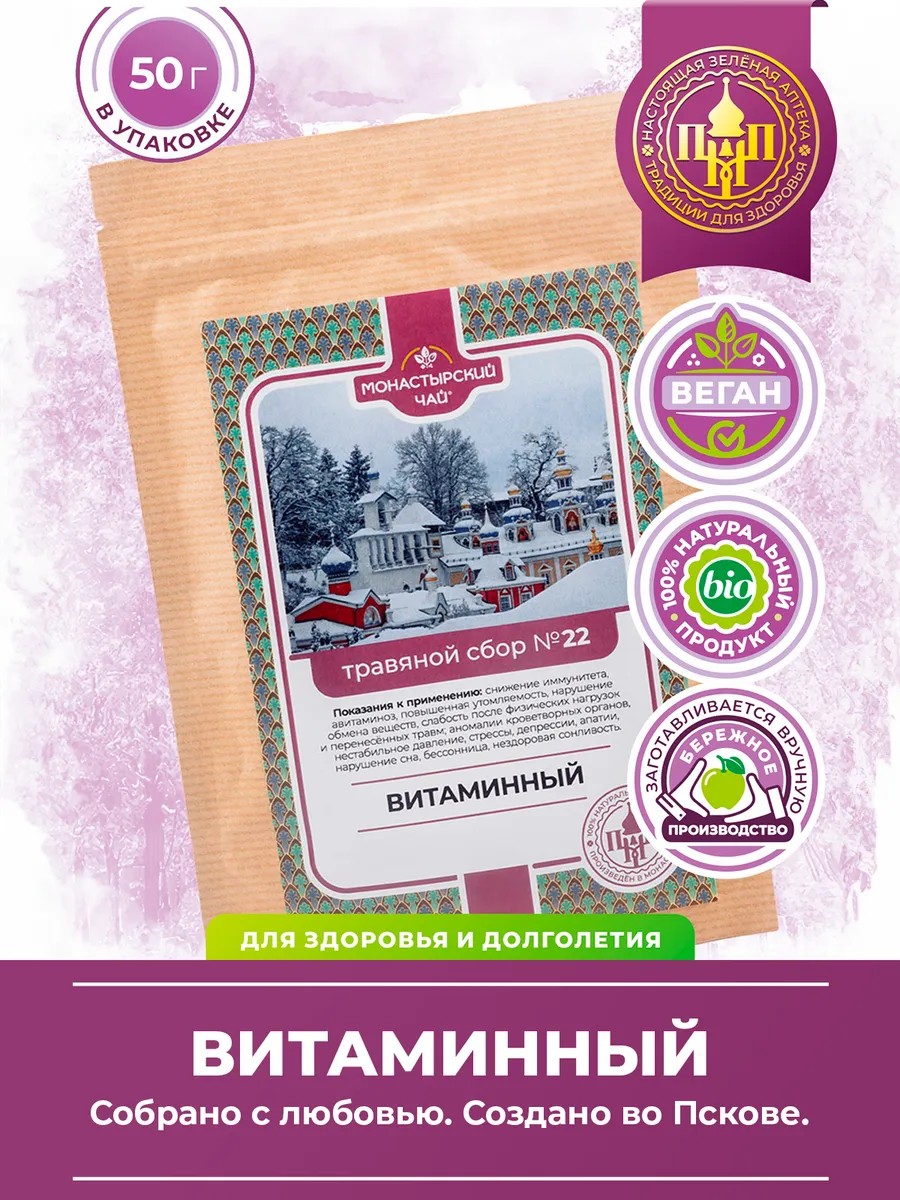 With the arrival of spring, many people are concerned about vitamin deficiency and related gastrointestinal issues. This healthy and delicious monastery tea is specially created to help in such cases. Herbal Vitamin Collection No. 22 harmoniously combines a variety of medicinal plants. Hawthorn not only replenishes micronutrient deficiencies but also has antioxidant properties. It helps balance intestinal microflora and strengthen smooth muscles. Black chokeberry, rich in vitamins P, C, B, E, K, manganese, and magnesium, supports the cardiovascular and nervous systems and improves digestion. Thyme helps strengthen the immune system, relieve anxiety, and fight colds and flu. Tea containing chamomile and mint is an excellent sedative. Rosehip has a beneficial effect on blood composition and increases resistance to colds. Peach leaves enrich this herbal gastrointestinal tea with diuretic, immunomodulatory, and antitumor properties. With its balanced herbal properties, this monastery tea is a wonderful vitamin complex for women, men, children, and adolescents; it's an effective remedy for detoxifying the body. This aromatic herbal tea will remove accumulated toxins over the winter, help relieve weakness, and is a great support for the gastrointestinal tract. Drinking a freshly brewed tea 2-3 times daily will boost your body's resistance to infections, help combat sleep disturbances and fatigue, and support your body after surgery and acute respiratory viral infections. This environmentally friendly, vitamin-free monastery tea contains no preservatives, dyes, or dietary supplements. This healthy and delicious tea is safe for your health, has a general strengthening effect, and increases vitality. Brew 10-15 grams per cup of boiling water. Natural, vitamin-rich herbs are packaged in convenient 50g sachets and have a shelf life of two years when stored at a temperature no higher than 25°C (77°F). You can purchase affordable monastery tea from us, whether for personal use or as a gift for a loved one for a birthday, name day, or other special occasion.