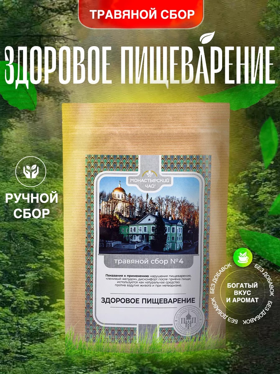 This collection will help improve digestion, reduce bloating, relieve flatulence and heaviness after meals. The herbs we put in our collection have the following properties: mint leaves - stimulate the secretion of gastric juice, reduce gas formation, relieve spasms; calamus root, rose hips leaves and rowan berries - analgesic, antimicrobial, diuretic and choleretic properties; licorice root - prevents stomach irritation; chamomile flowers - antispasmodic, anti-inflammatory, reduces flatulence; plantain leaves - enveloping, stimulates the production of digestive enzymes; yarrow herb - eliminates stagnation of digestive secretions, normalizes phospholipid metabolism (promotes weight loss); Collection No. 4 Healthy Digestion - a real monastic healing tea. It is made in the Holy Dormition Pskov-Pechersky Monastery using medicinal herbs collected in ecologically clean regions.