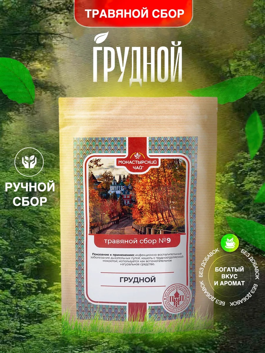 Противокашлевый грудной сбор №9 — надежный помощник в борьбе против любого вида кашля у взрослых мужчин и женщин и оптимальный выбор для всех, кто хочет иметь здоровые легкие: комплекс тщательно подобранных сухих растений отличается высокой эффективностью и минимумом противопоказаний к применению. Обладая полностью натуральным составом без красителей, искусственных добавок и консервантов, полезный фиточай показан как в составе комплексной терапии в сочетании с медикаментозными средствами, так и для отдельного использования. Лечебный монастырский сбор рекомендован для профилактики и лечения различных заболеваний дыхательной системы: сушеные лекарственные травы сохраняют высокую концентрацию активных веществ и помогают облегчить симптомы простуды, гриппа и многих других респираторных заболеваний, смягчить слизистые, уменьшить боль и першение в горле. Травяной напиток незаменим при обострениях заболеваний бронхов, включая ларингиты, хронические и обструктивные бронхиты и бронхиальную астму: он способствует выведению мокроты, снятию воспалений, быстрому и значительному улучшению самочувствия. Регулярное заваривание и употребление фито чая не только облегчает дыхание и ускоряет выздоровление, но и приводит к существенному укреплению иммунитета, помогает активизировать защитные функции, оказывает положительное влияние на состояние здоровья в целом. СОСТАВ: плоды шиповника и фенхеля, цветки календулы, корень солодки, листья подорожника, трава