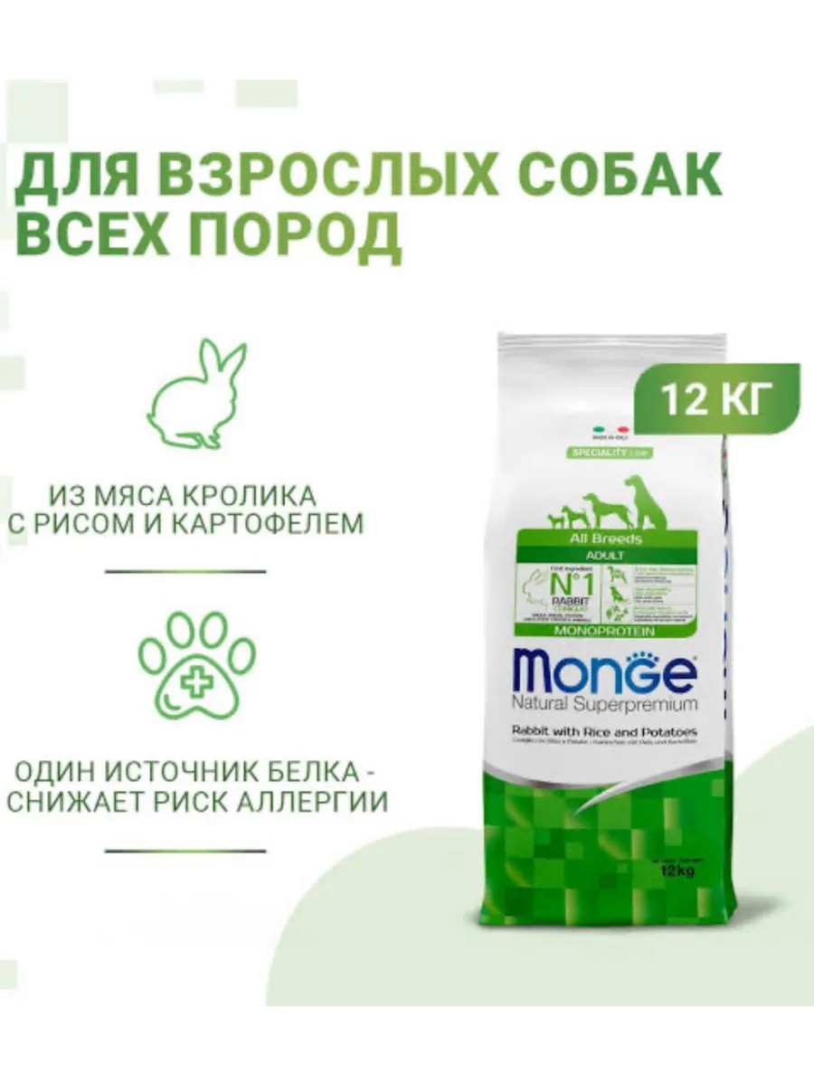 Monge Dog Monoprotein сухой корм для взрослых собак всех пород с кроликом, рисом и картофелем 12 кг