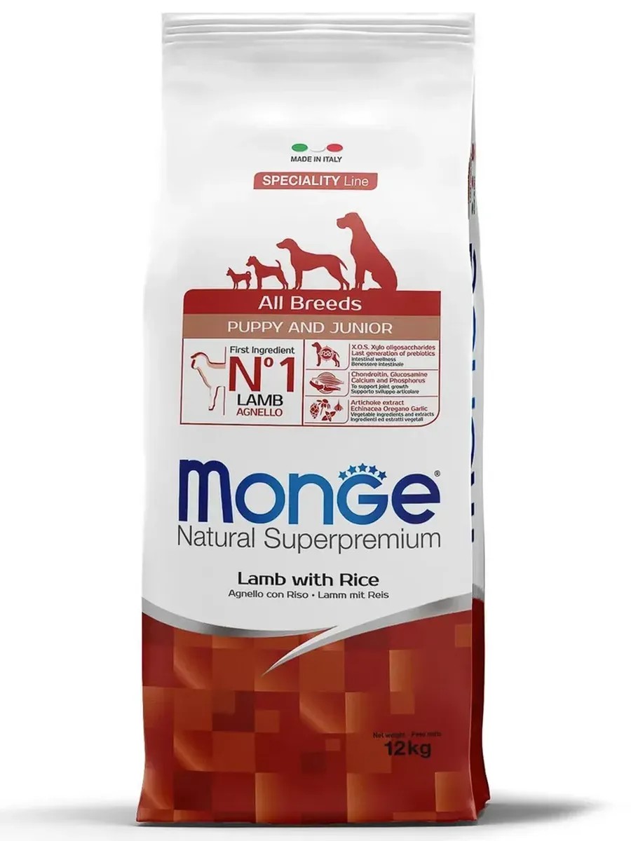 Monge Dog puppy & junior Lamb rice potatoes - корм для щенков всех пород ягненок с рисом и картофелем 12 кг. Полнорационный корм для взрослых собак всех пород с ягненком, рисом и картофелем. Идеально подходит для молодых собак , нуждающихся в питании с низким содержанием холестерина. Ингредиенты, входящие в состав, помогают бороться с аллергическими реакциями и воспалениями и подходит для собак с проблемами пищеварения. Входящие в состав КОС (ксилоолигосахариды) поддерживают здоровую микрофлору кишечника.Мясо ягненка и рис - это гарантия правильного усвоения белков и углеводов. Высокое содержание сбалансированных омега-3 и омега-6 жирных кислот, цинка и биотина обеспечивает блестящую шерсть и здоровую кожу питомца. Глюкозамин, хондроитин и МСМ благотворно влияют на здоровье суставов и всего костного аппарата, помогают предотвратить возникновение болезней суставов. Не содержит искусственных красителей и консервантов.