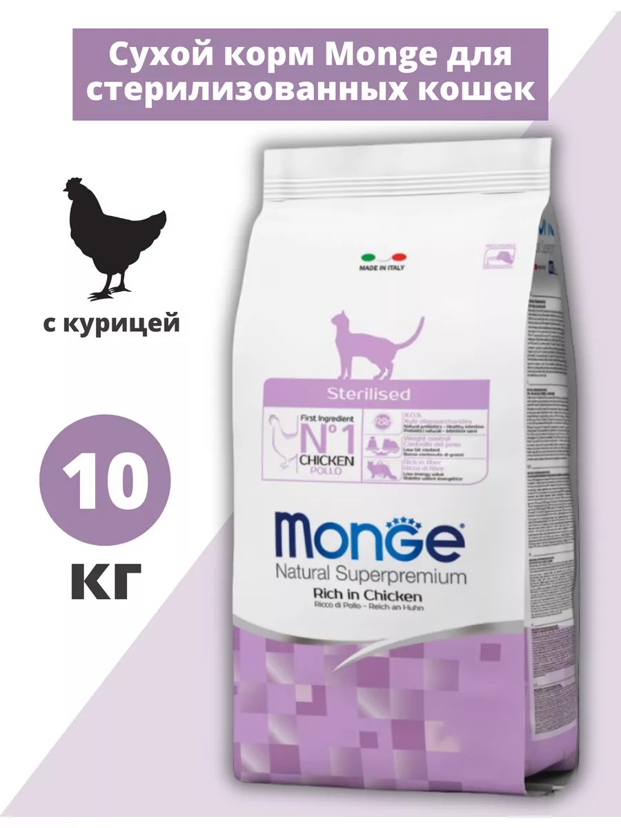 Будьте внимательны при заказе товара! В карточке представлено несколько фасовок корма! Monge (Монж) Cat Daily Line Sterilised Chicken сухой корм из мяса курицы для стерилизованных кошек и кастрированных котов 10 кг. Полнорационный сбалансированный корм для стерилизованных кошек с пониженным содержанием калорий, обеспечивающий профилактику ожирения. Содержит важнейшие антиоксиданты, такие как витамин Е, для поддержания иммунной системы. Пребиотики М.О.S и X.O.S. помогают сохранять естественный баланс кишечной микрофлоры и способствуют оптимальному усвоению питательных веществ. Обогащён клетчаткой. Одно из важнейших полезных свойств клетчатки в кормах для кошек, заключается в её способности контролировать вес животного. Добавление в корм волокна, медленной ферментации, помогает предотвратить ожирение и способствует снижению веса. Без ГМО, искусственных красителей и ароматизаторов. Благодаря высокой вкусовой привлекательности Monge Sterilised with Chicken представляет собой лакомство для питомца, лакомство для котов и кошек.