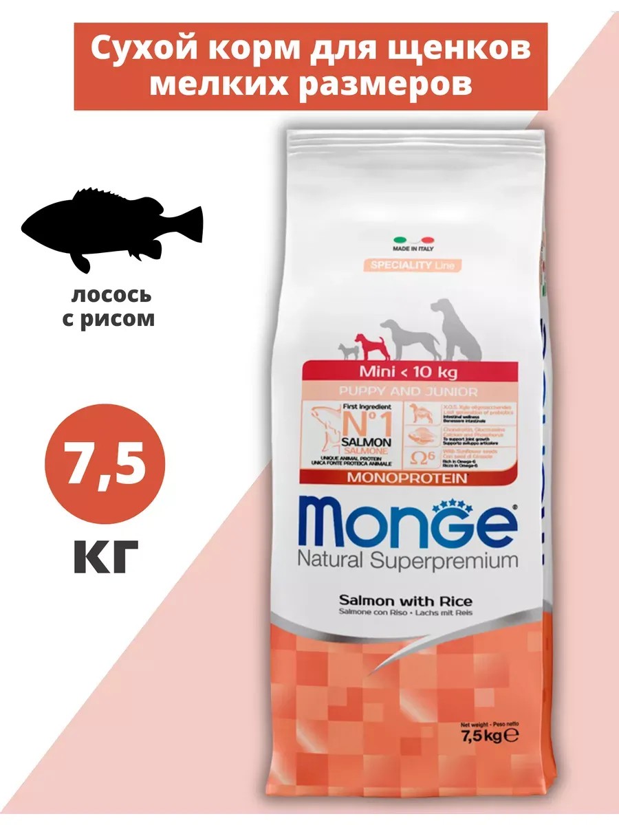 Monge (Монж) Dog Speciality Line Monoprotein Mini Puppy Junior Salmon with Rice сухой корм из лосося и риса для щенков мелких пород 7,5 кг. Полнорационный сбалансированный корм, разработанный специально для ежедневного кормления щенков мелких пород в возрасте от 2 до 12 месяцев. Основой рациона является легкоусвояемое мясо лосося и бурый рис. Корм отлично усваивается и способствует правильному развитию щенка. Пребиотики М.О.S и X.O.S. помогают сохранять естественный баланс кишечной микрофлоры и способствует оптимальному усвоению питательных веществ и укрепляет иммунитет. Комплекс растительных ингредиентов и экстрактов, таких как экстракт артишока, эхинацея, орегано и чеснок, являются природными иммуностимуляторами и гепатопротекторами. Глюкозамин, хондроитин, кальций и фосфор, в данном рационе, для поддержания здоровья суставов опорно-двигательного аппарата и нормального роста щенка. Без ГМО, искусственных красителей и ароматизаторов. Благодаря высокой вкусовой привлекательности Monge Mini Puppy and Junior Salmon with Rice представляет собой лакомство для питомца, лакомство для щенков.
