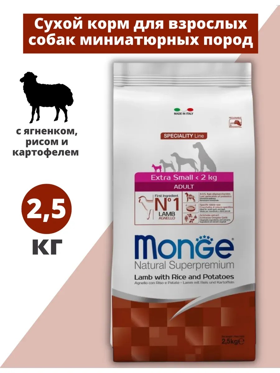 Будьте внимательны при заказе! В карточке представлено несколько вкусов корма. Monge (Монж) Dog Speciality Line Extra Small Adult Lamb with Rice and Potatoes сухой корм из мяса ягнёнка с рисом и картофелем для взрослых собак миниатюрных пород 2,5 кг. Полнорационный сбалансированный сухой корм из мяса ягнёнка с рисом и картофелем для собак. Предназначен для ежедневного кормления взрослых собак миниатюрных пород до 2 кг с нормальной физической активностью.