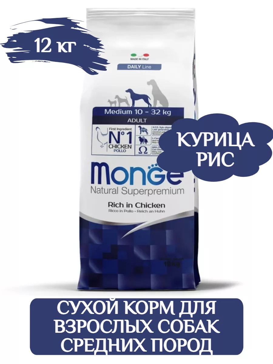Monge Dog Daily Line Medium сухой корм из мяса курицы для взрослых собак средних пород. Полнорационный сбалансированный сухой корм из мяса курицы и рисом для собак. Предназначен для ежедневного кормления взрослых собак средних пород от 10 до 32 кг с нормальной физической активностью. Основой рациона является легкоусвояемое мясо курицы. Корм отлично усваивается и способствует правильному пищеварению. Пребиотики М.О.S и X.O.S. помогают сохранять естественный баланс кишечной микрофлоры и способствует оптимальному усвоению питательных веществ. Легко усвояемое мясо курицы на первом месте в составе корма и содержание L-карнитина позволяет питомцу долгие годы сохранять активность и хорошую физическую форму. Оптимальный баланс Омега-3 и Омега-6 жирные кислоты в составе корма чрезвычайно важен для поддержания красоты шерсти и здоровья кожи. Питательная ценность: сырой белок 26%, сырой жир 14%, сырая клетчатка 2,2%, сырая зола 6,5%, кальций 1,2%, фосфор 1%, омега-6 жирные кислоты 5,2%, омега-3 жирные кислоты 0,7%. Энергетическая ценность: 4 000 ккал/кг. Питательные добавки в 1 кг: витамин A (ретинола ацетат) 30 700 МЕ, витамин D3 1610 МЕ, витамин Е (альфа-токоферола ацетат) 72 мг, селен (селенит натрия 0,4 мг) 0,2 мг, марганец (сульфат марганца моногидрат 92 мг) 30 мг, цинк (оксид цинка 174 мг) 140 мг, медь (сульфат меди [II] пентагидрат 47 мг) 12 мг, железо (сульфат железа [II] моногидрат 304 мг) 100 мг, йод (йодат кальция безводный 2,4 мг) 1,6 мг, L-карнитин: 110 мг, технически чистый DL-метионин 1500 мг. Технологические добавки: Антиоксиданты: экстракт токоферолов из растительных масел. Вкусовые добавки: экстракт каштана (Castanea sativa) 20 мг/кг.