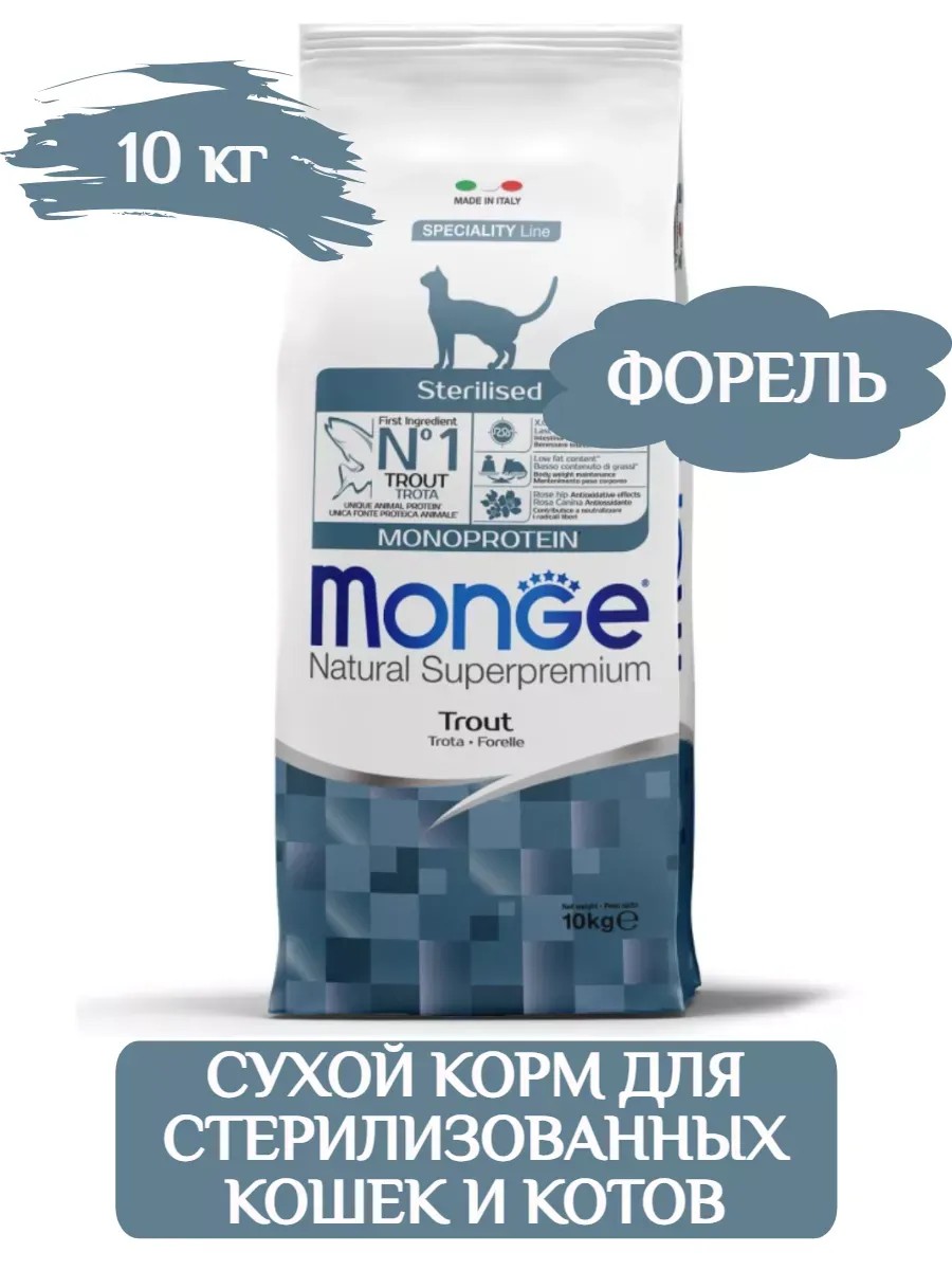 Monge Cat Speciality Line Monoprotein - сухой корм из форели для стерилизованных кошек и кастрированных котов. Сбалансированный полнорационный корм для стерилизованных кошек, который разработан на основе одного источника белка животного происхождения – форели. Идеально подходит для питомцев, которые обладают повышенной чувствительностью к компонентам корма или нуждаются в исключающей диете. Свежее мясо в составе делает корм ещё более аппетитным и привлекательным даже для самых привередливых кошек. Пониженное содержание жира и калорий, обеспечивают профилактику ожирения. Содержит важнейшие антиоксиданты, в том числе витамин Е, для поддержания иммунной системы. Пребиотики М.О.S и X.O.S. помогают сохранять естественный баланс кишечной микрофлоры и способствует оптимальному усвоению питательных веществ. Питательная ценность: сырой белок 37%, сырая клетчатка 3%, сырые жиры 12%, сырая зола 5,5%, кальций 0,6%, фосфор, 0,5%, магний 0,07%, натрий 0,1%, омега-3 жирные кислоты: 0,3%, омега-6 жирные кислоты: 3%. Энергетическая ценность: 3 980 ккал/кг. Питательные добавки в одном кг: Витамин A (ретинола ацетат): 30 700 МЕ, Витамин D3: 1 620 МЕ, Витамин Е (альфатокоферола ацетат): 72 мг, селен (селенит натрия 0,4 мг): 0,2 мг, марганец (сульфат марганца моногидрат - 103 мг): 33 мг, цинк (оксид цинка - 196 мг): 157 мг, медь (сульфата меди [II] пентагидрат 53 мг): 13 мг, железо (сульфата железа [II] моногидрат 342 мг): 112 мг, йод (йодат кальция безводный - 2,7 мг): 1,8 мг, технически очищенный DL-метионин: 1 000 мг, таурин: 1 200 мг, L-карнитин: 500 мг. Технологические добавки: богатые токоферолом экстракты натурального происхождения из растительных масел.