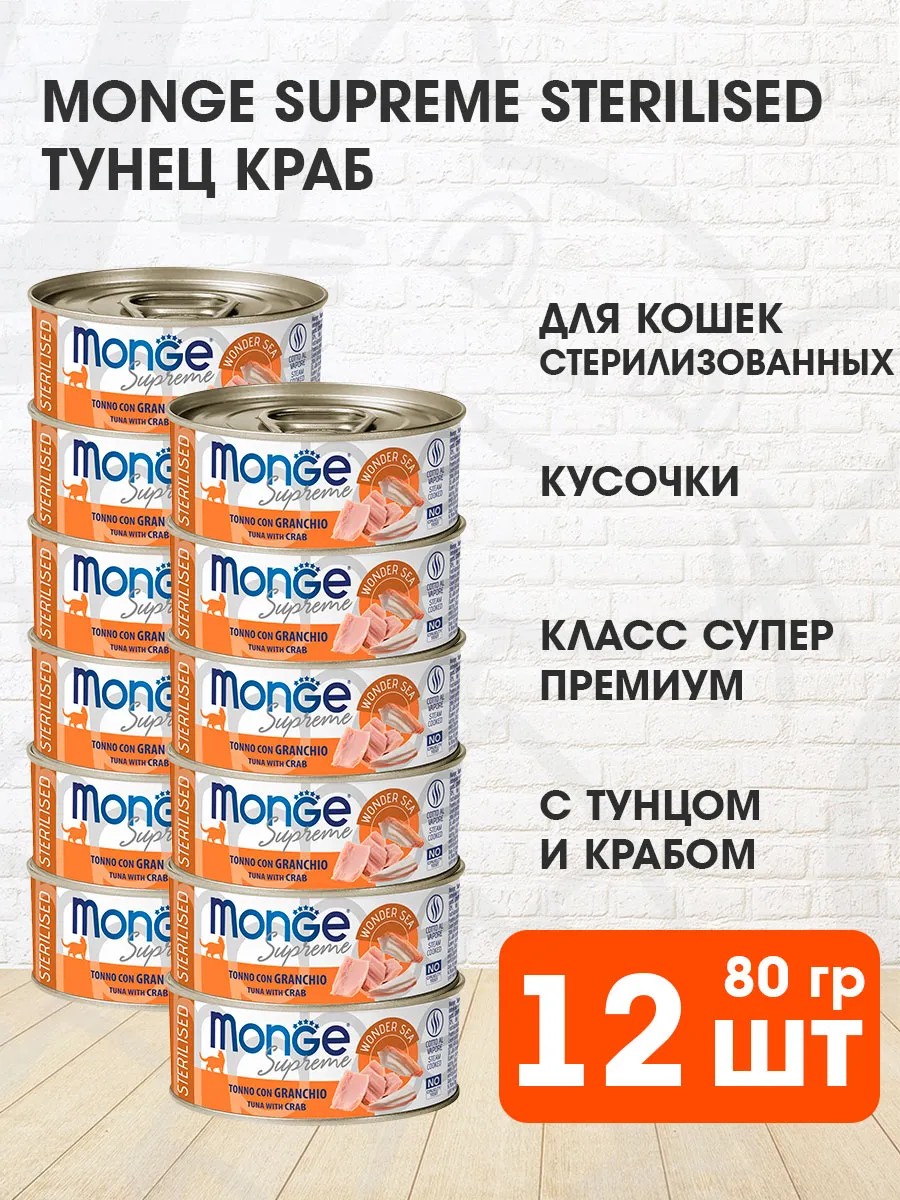MONGE Корм Supreme для стерилизованных кошек тунец краб 80 г 12 шт
