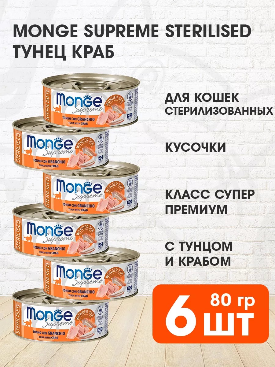 MONGE Корм Supreme для стерилизованных кошек тунец краб 80 г 6 шт