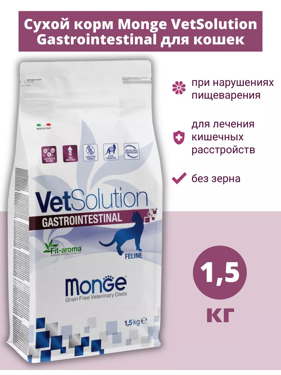 Лечебный сухой корм Monge (Монж) VetSolution Cat Gastrointestinal для кошек Гастроинтестинал при заболеваниях желудочно-кишечного тракта, таких как гастрит, колит, острый и хронический гастроэнтерит, диарея и избыточный бактериальный рост в тонком отделе кишечника 1,5 кг. Monge VetSolution Gastrointestinal Adult — полнорационный сухой диетический корм из свинины для кошек «Gastrointestinal » для устранения симптомов расстройства пищеварения у кошек. Содержит концентрат сока дыни для нейтрализации свободных радикалов. Fit-aroma - конский каштан для поддержки здоровья кишечника.