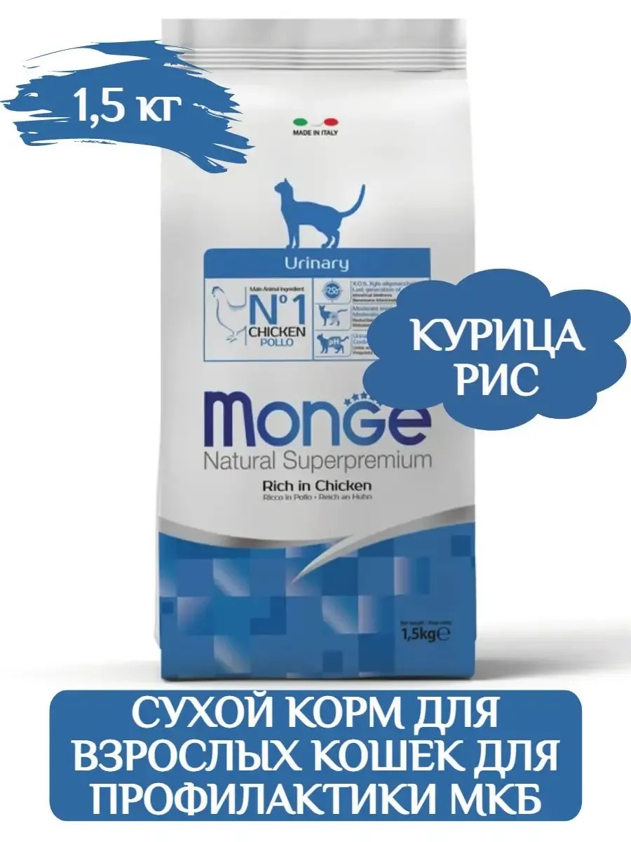 Monge (Монж) Cat Urinary сухой корм из мяса курицы для профилактики МКБ у взрослых кошек и котов. Полнорационный сбалансированный корм для взрослых кошек, помогающий снизить риск рецидива образования кристаллов и камней струвитного типа в мочевом пузыре. Сбалансированное содержание магния, кальция и фосфора способствует поддержанию нормального функционирования мочевыводящих путей, а высокое содержание белков животного происхождения обеспечивает контроль уровня рН мочи (слабо-кислый оказавает подкисляющие свойство), что в комплексе снижает риск развития мочекаменной болезни струвитного типа. Пребиотики М.О.S и X.O.S. помогают сохранять естественный баланс кишечной микрофлоры и способствуют оптимальному усвоению питательных веществ. Питательная ценность: сырой белок: 31%, сырая клетчатка: 2,5%, сырой жир: 16%, сырая зола: 5%, кальций: 0,8%, фосфор: 0,8%, натрий: 0,2%, магний: 0,06%, калий: 1,2%, хлориды: 1,9%, сера: 0,16%, омега-3 жирные кислоты: 0,4%, омега-6 жирные кислоты: 4,5%. Подкисляющие мочу элементы: хлорид аммония: 0,2%, хлорид калия: 0,4%. Энергетическая ценность: 4 200 ккал/кг. Питательные добавки в 1 кг: витамин A (ретинола ацетат): 32 300 МЕ, витамин D3: 1690 МЕ, витамин Е (альфа-токоферола ацетат): 75 мг, селен (селенит натрия 0,27 мг): 0,12 мг, марганец (сульфат марганца моногидрат 58 мг): 19 мг, цинк (оксид цинка 109 мг) 87,5 мг, медь (сульфат меди [II] пентагидрат 29 мг) 7,5 мг, железо (сульфат железа [II] моногидрат 190 мг) 62,5 мг, йод (йодат кальция безводный 1,5 мг) 1 мг, L-карнитин 1000 мг, технически чистый DL-метионин 1000 мг, таурин 1100 мг. Технологические добавки: экстракт токоферолов из растительных масел.